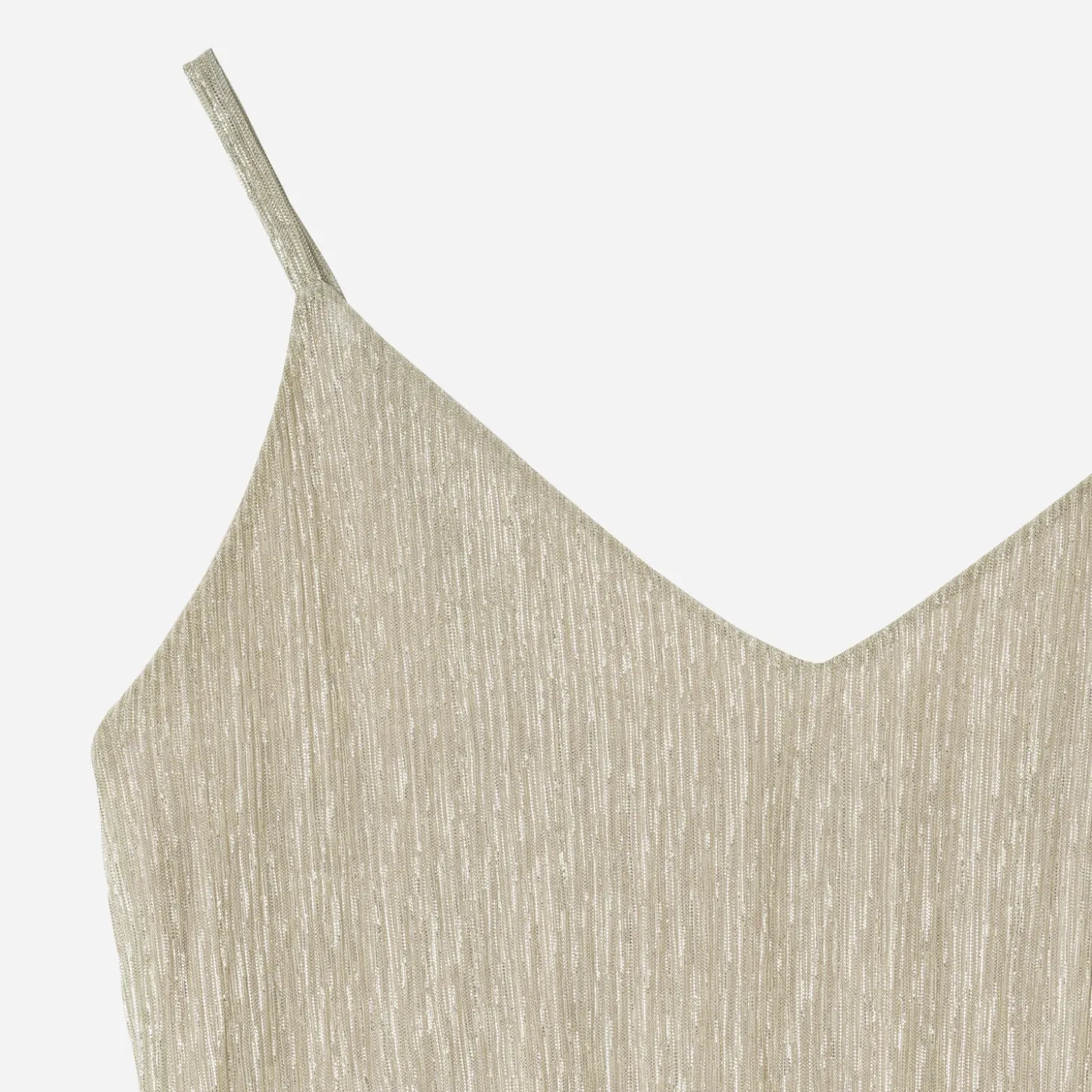 La slip dress, reconnaissable à ses bretelles spaghetti, a conquis le monde de la mode. De couleur beige, sur un tissu plissé à effet rayures dorées, cette pièce versatile, à la fois confortable et élégante, se porte de jour comme de nuit. Pour un look casual en journée, avec une veste oversize et des baskets. En soirée, avec des sandales à talon haut, elle revendique une allure ultra-féminine.