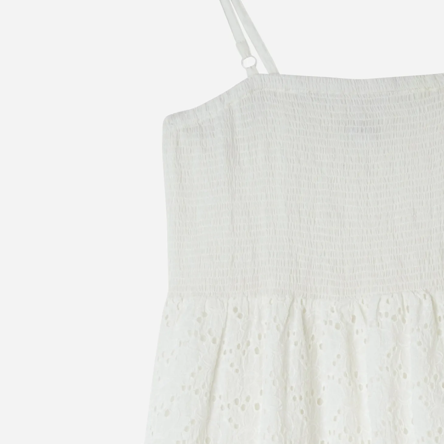 Forme droite, col droit, fines bretelles ajustables, smocks sur le bustier, découpe taille, taille élastiquée, broderie anglaise, doublure unie, longueur de la robe : 132 cm pour une taille S