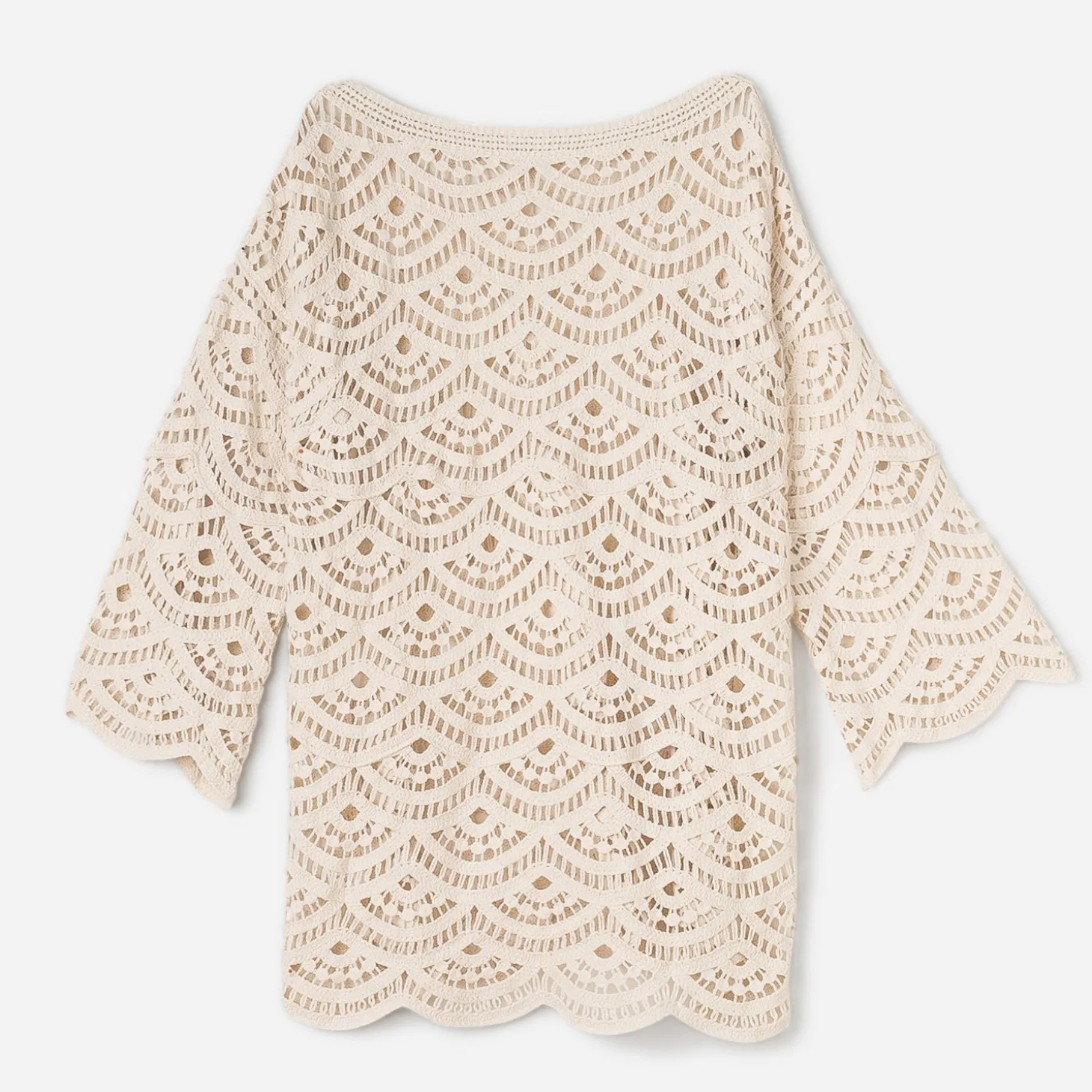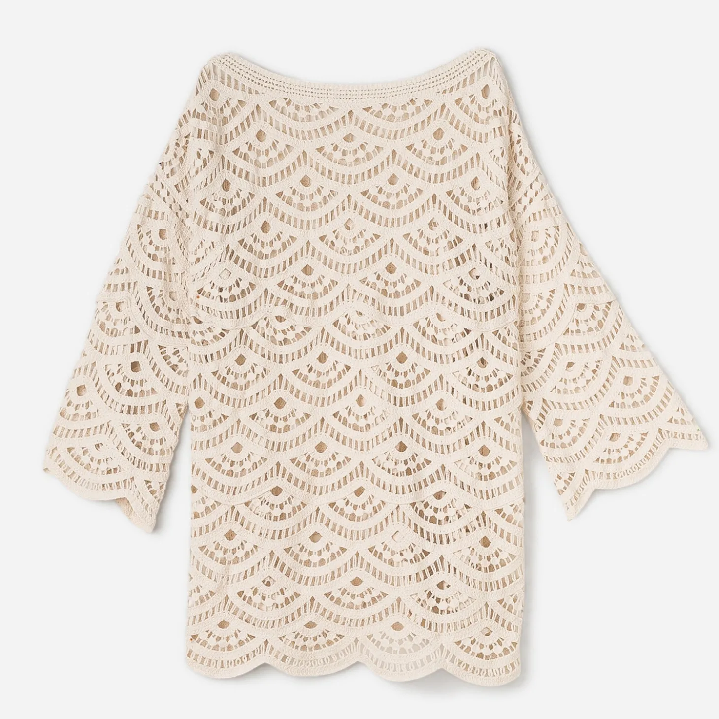 Laissez convaincre par l’incroyable potentiel mode de cette robe en macramé. En coton écru, elle se porte, en journée, esprit robe de plage sur un maillot de bain, et en soirée, avec un dessous de robe ivoire, une capeline et des sandales dorées à talon.