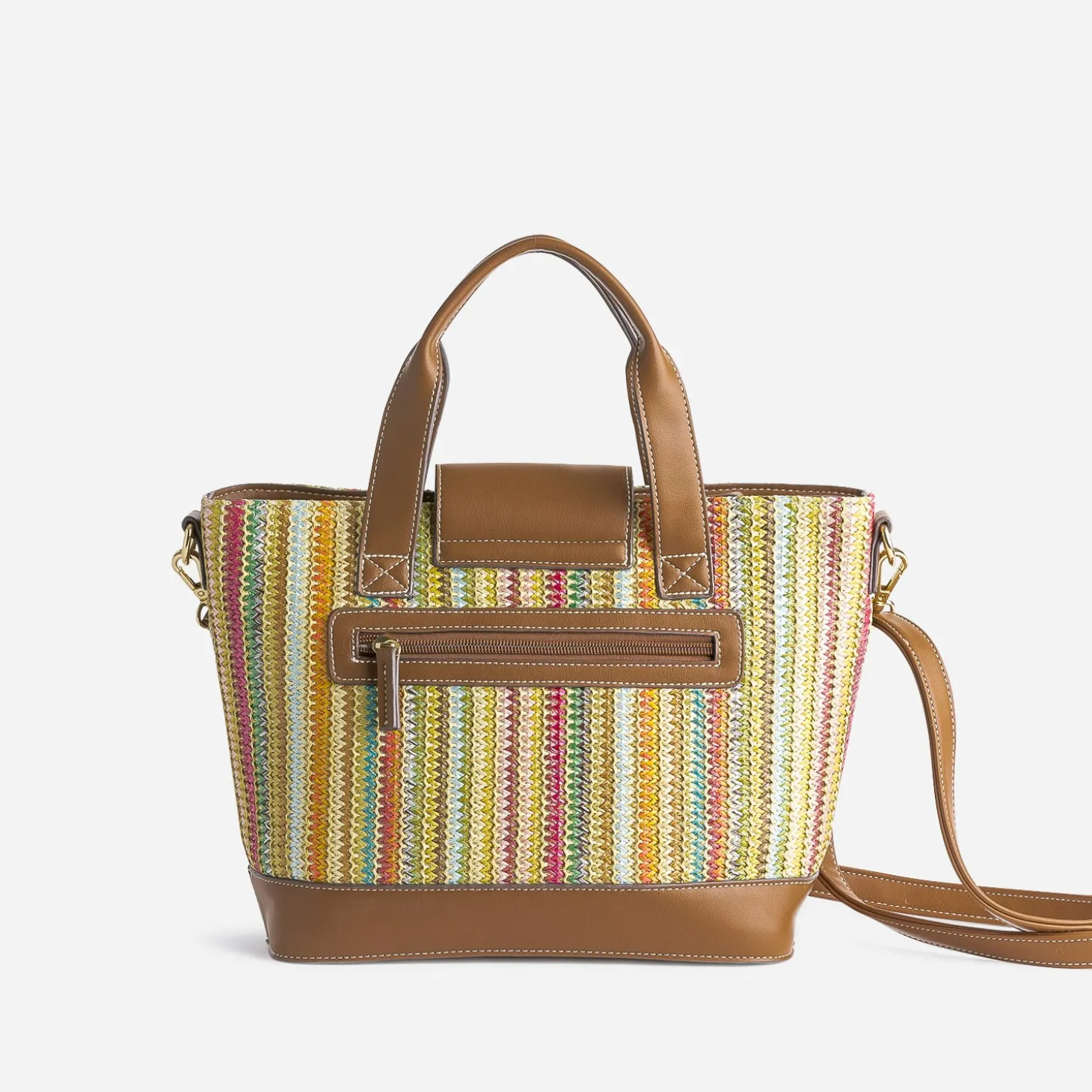 L’été appelle des touches colorées, des techniques artisanales, le tout réinventé pour le monde urbain. La preuve avec ce sac à main pour femme. En matière synthétique, il associe un tressage multicolore au camel élégant et métalleries dorées raffinées. Le compartiment principal présente 2 poches internes dont 1 zippée, et se ferme par zip et aimant. A la main, sur l’épaule ou croisé, adaptez son porté à votre activité. Fermeture par zip et aimant. 1 compartiment, avec 2 poches internes, dont 1 zippée. 1 poche externe zippée. Bandoulière réglable et amovible. Dimensions : 23 cm (h) x 38 cm (l) x 12 cm (p)