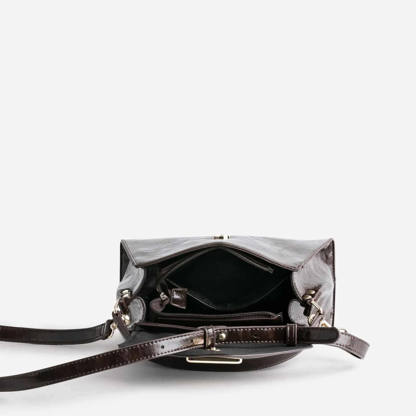 Une courte anse pour un porté à la main ou sur l’avant bras. Une bandoulière réglable et amovible, pour un porté sur l’épaule ou croisé. Ce sac à main séduit d’abord par sa fonctionnalité. Il n’en délaisse pas pour autant le style, signé par sa forme trapèze fantaisie, sa matière synthétique rigide et son coloris marron foncé avec effet patiné. Un accessoire esprit rétro, qui apporte du chic, à toutes les tenues.
