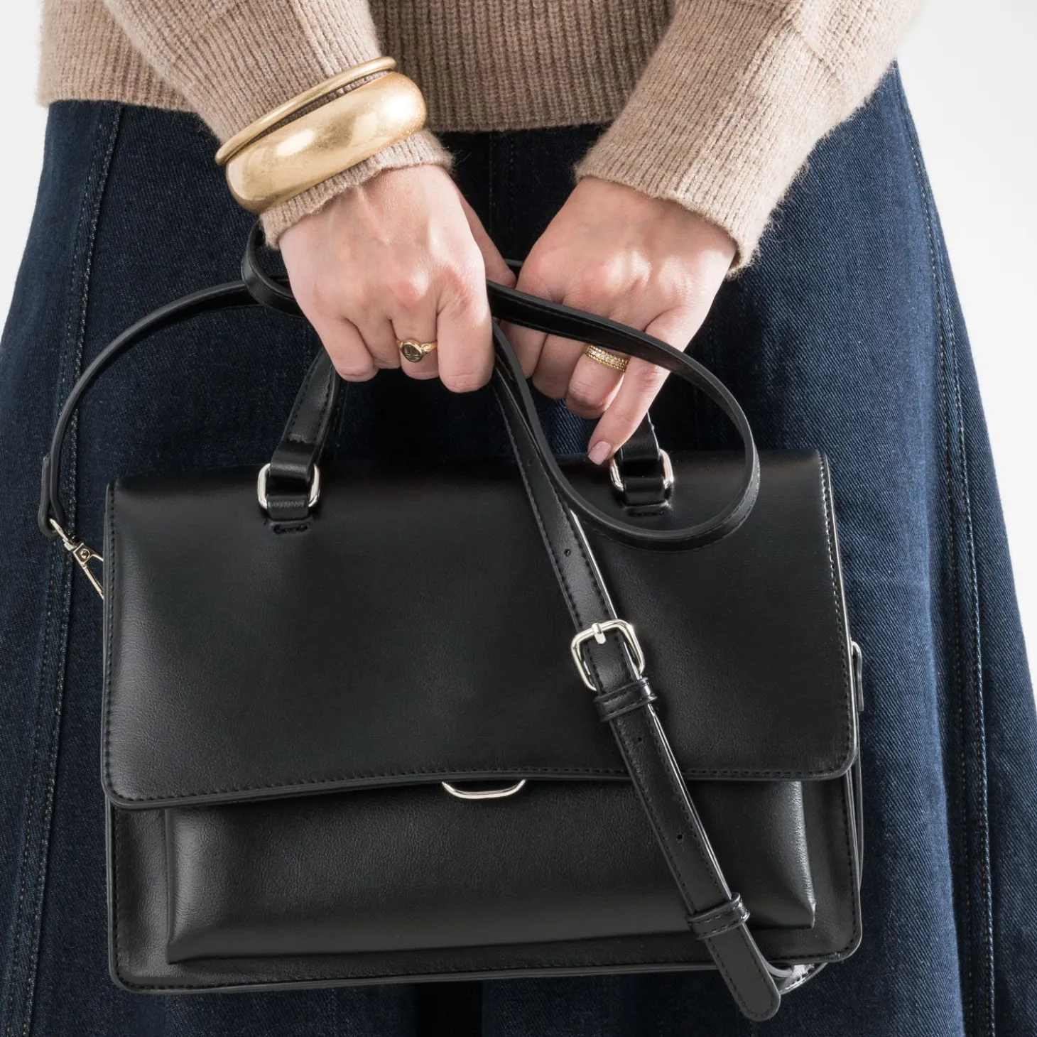 Porté à la main ou sur l’épaule ? Posé sur l’avant-bras ou croisé ? Votre indécision est notre moteur, pour donner naissance un sac à main qui s’adapte parfaitement à votre quotidien. Appréciez son format moyen, sa matière synthétique rigide sur un design épuré, son coloris noir, qui matche avec tout, sans effort. Longue bandoulière en journée ou anses courtes en soirée, un modèle pensé pour devenir votre allié.