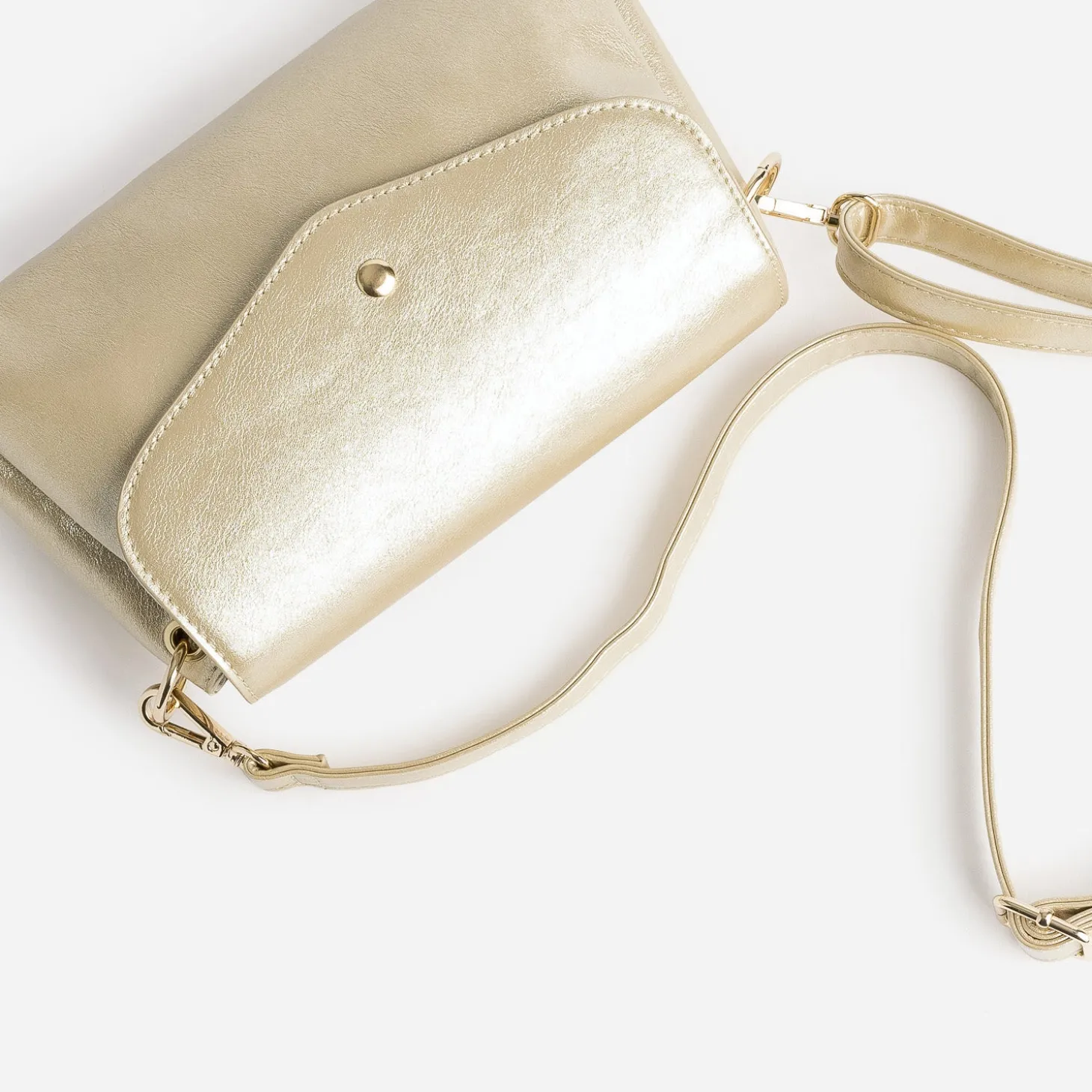 De format moyen, ni trop petit ni trop grand, ce sac à main pour femme a été pensé pour le quotidien. En matière synthétique, il séduit par sa souplesse et par son coloris doré et sa finition métallisée, parfaitspour la saison, mais aussi par ses 3 compartiments, pour une organisation optimale. Ses alliés mode ? Un costume pastel, ou une chemise bleue à fines rayures sur un jean, avec des mocassins assortis.