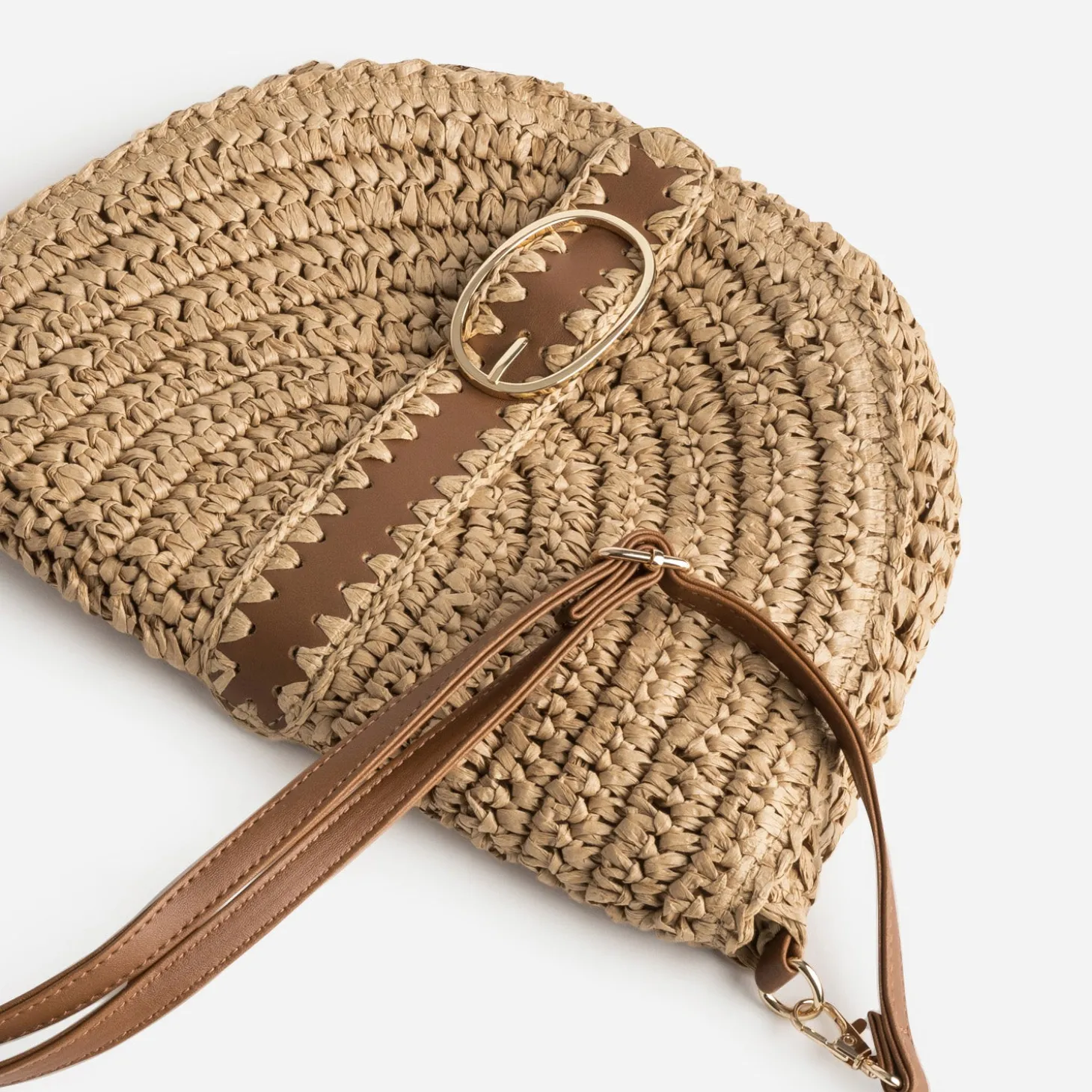 Une forme arrondie. Une matière, toute en légèreté. Un jeu de tressage étudié. Une large patte en matière synthétique brodée. Le sac à main passe en mode estival. La bandoulière amovible et réglable, permet un porté sur l’épaule ou croisé. Un modèle à préférer avec un look décontracté, débardeur, short en jean et long kimono imprimé.