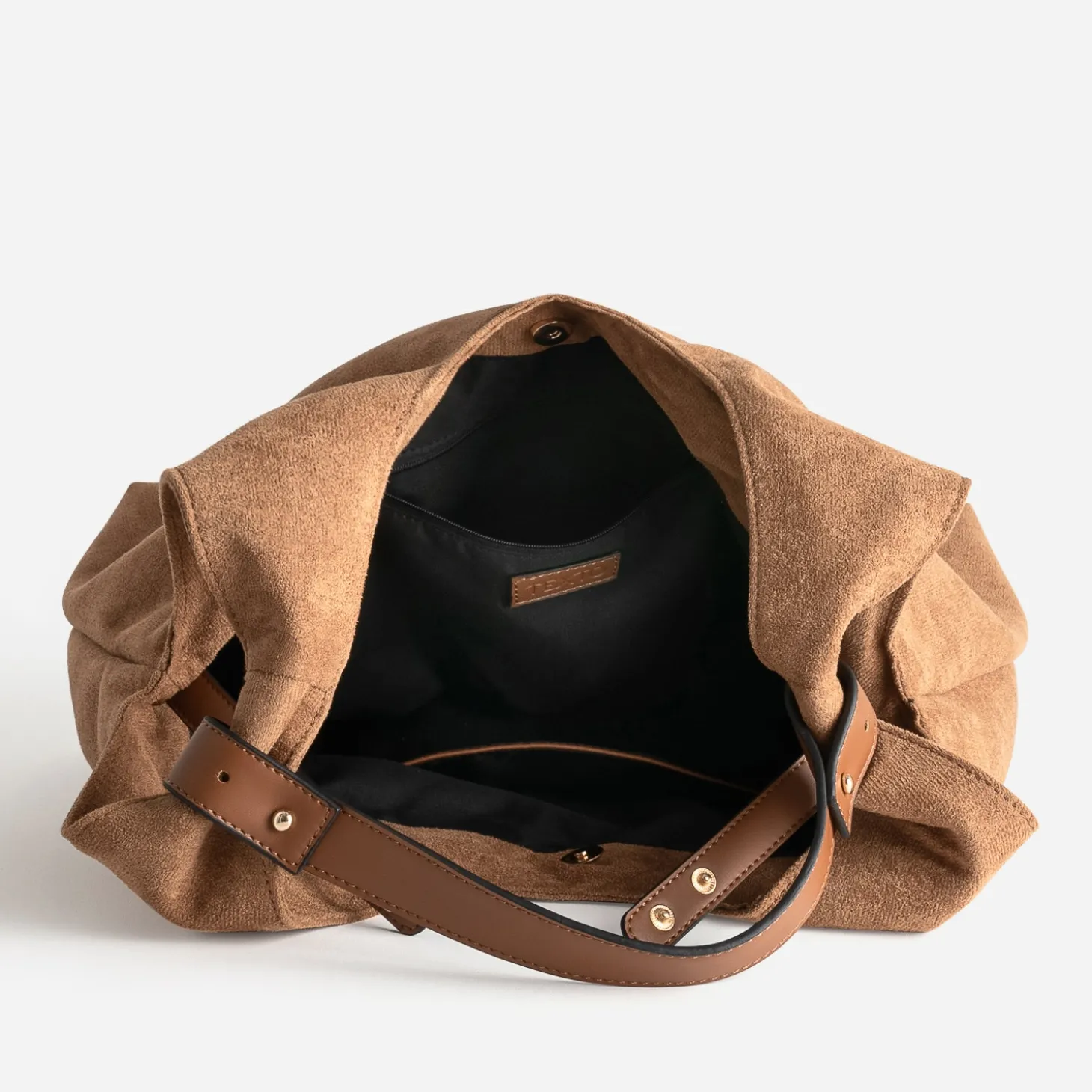 Le sac forme hobo ne se pose que sur l’épaule, et son volume peut se moduler par une pression, en fonction de ce qu’il contient, grâce à une patte en matière synthétique. L’anse peut, elle aussi, s’ajuster, grâce à ses boutons cartouches. En textile suédé cognac, il est l’accessoire idéal pour une rentrée réussie, jusqu’aux accessoires.