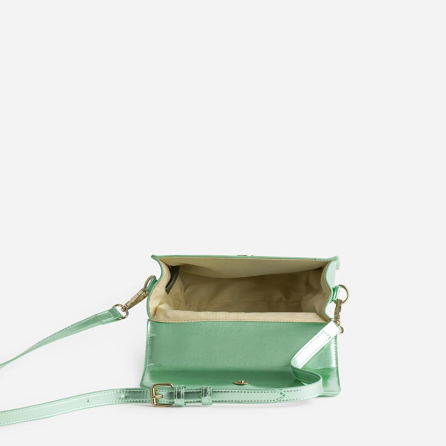 Invitez la couleur dans votre garde-robe estivale, avec ce petit sac à main vert d’eau. Remarquez sa finition métallisée et ses métalleries dorées, d’un chic évident. Appréciez son petit format, facile à transporter à la main, sur l’épaule ou croisé. Imaginez-le sur une robe fleurie, avec des sandales à talon, pour une prochaine cérémonie ou garden party.