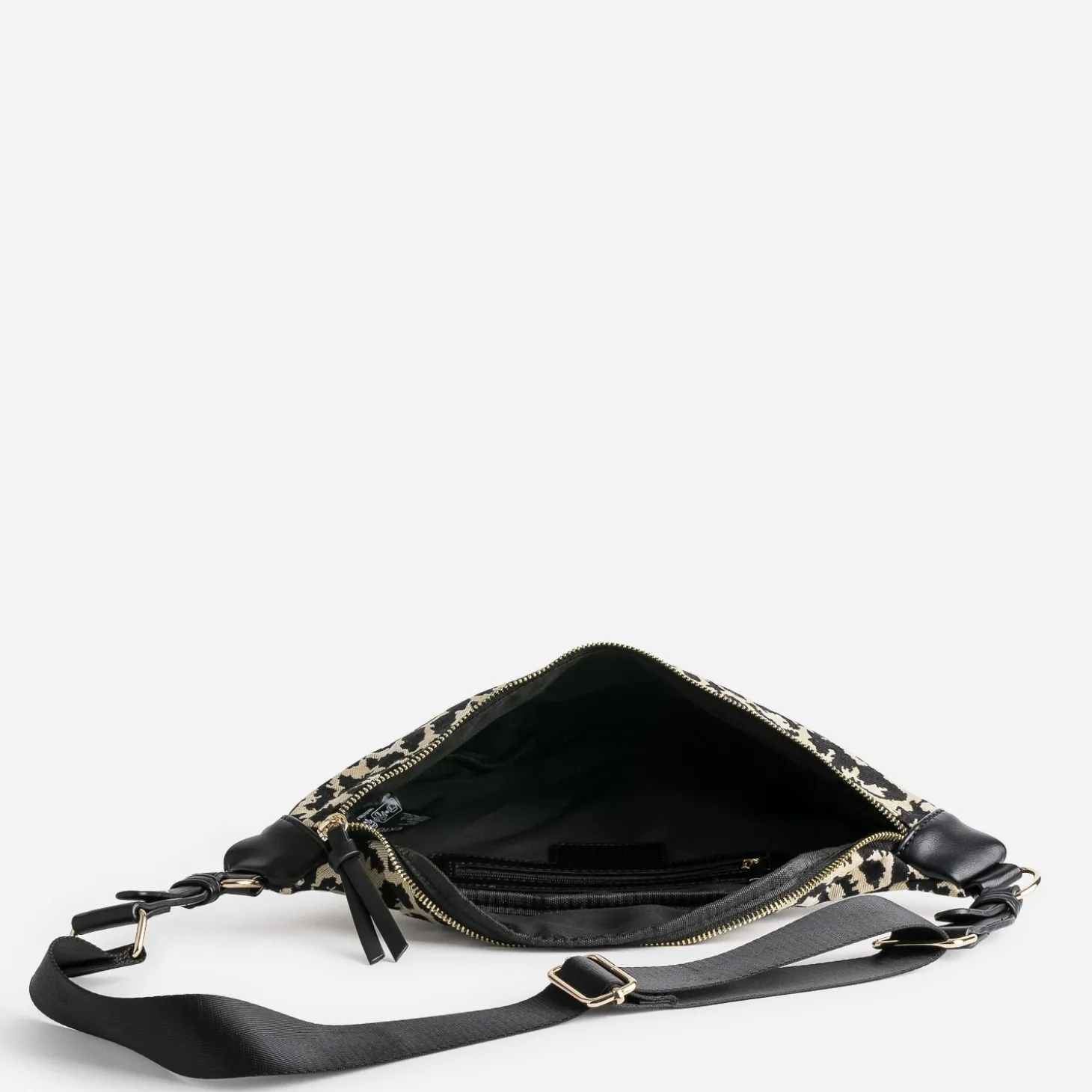 C’est le moment de passer le cap ! Le cap du sac-banane, it-bag incontournable de la saison. Laissez-vous convaincre par son motif léopard noir sur textile beige, et ajustez sa bandoulière, pour un porté cross-body. Parfait sur un total look noir ou beige, ou même rehaussé d’une touche de rouge vif, kaki ou orange.