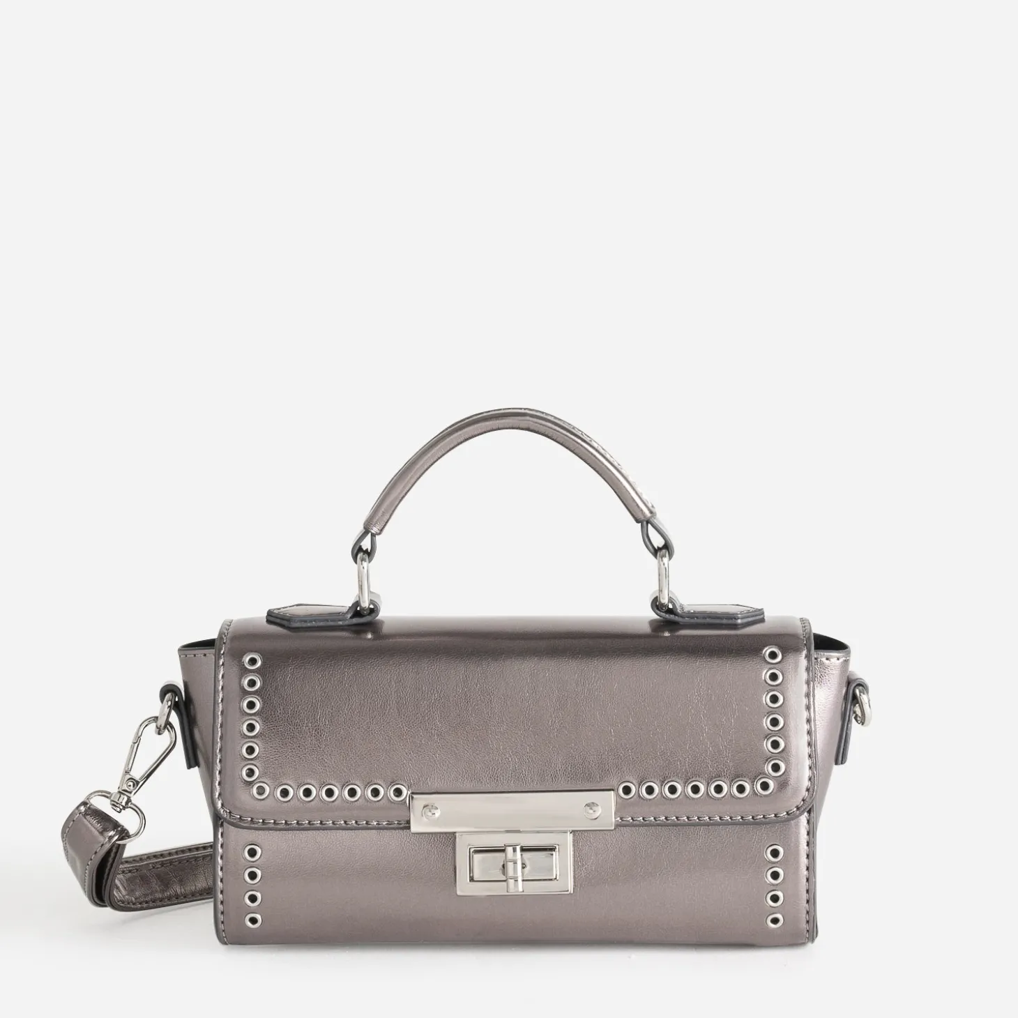 Les formats mini ont la cote ! Testez ce sac bandoulière pour femme, à porter à la main, grâce à la poignée, ou sur l’épaule ou croisé, grâce à la bandoulière réglable et amovible. En matière synthétique lisse, il se décline en coloris gun, un gris foncé métallisé, avec des métalleries argentées : œillets sur le rabat et devant, fermoir par tourniquet. Un accessoire résolument stylé, pour un twist rock, moderne et dans l’air du temps.