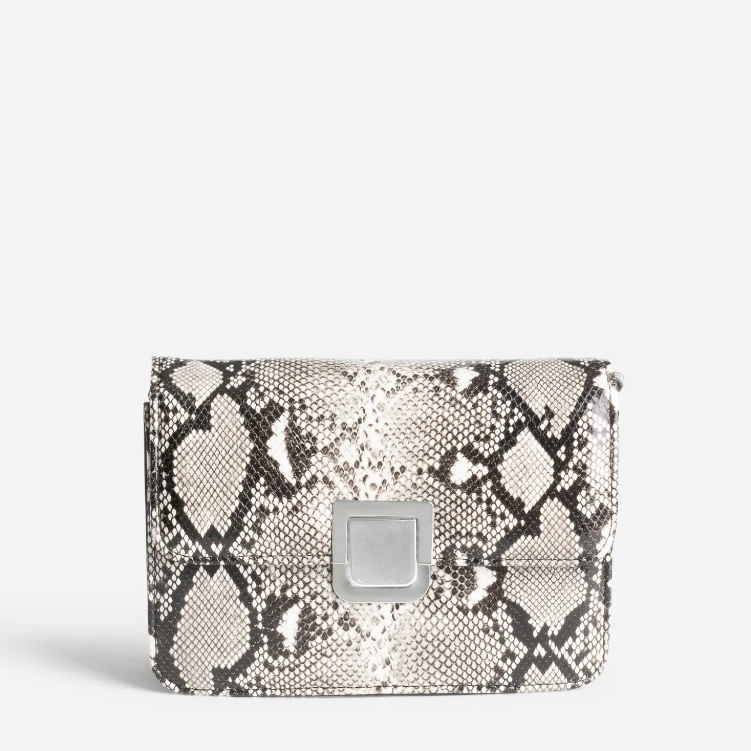 Qui dit rentrée, dit nouveau sac (à main) ! En matière synthétique rigide, il se décline en coloris noir, rythmé d’un imprimé effet python. Son format rectangulaire assure un porté élégant, sur l’épaule ou croisé, grâce à la bandoulière réglable (non amovible). Le rabat se ferme par un système de clip-cartable fantaisie (appuyez vers le bas pour libérer le rabat). Un accessoire à privilégier avec un pull-chaussette rouge foncé à col roulé sur un jean large gris, avec des boots esprit rétro.