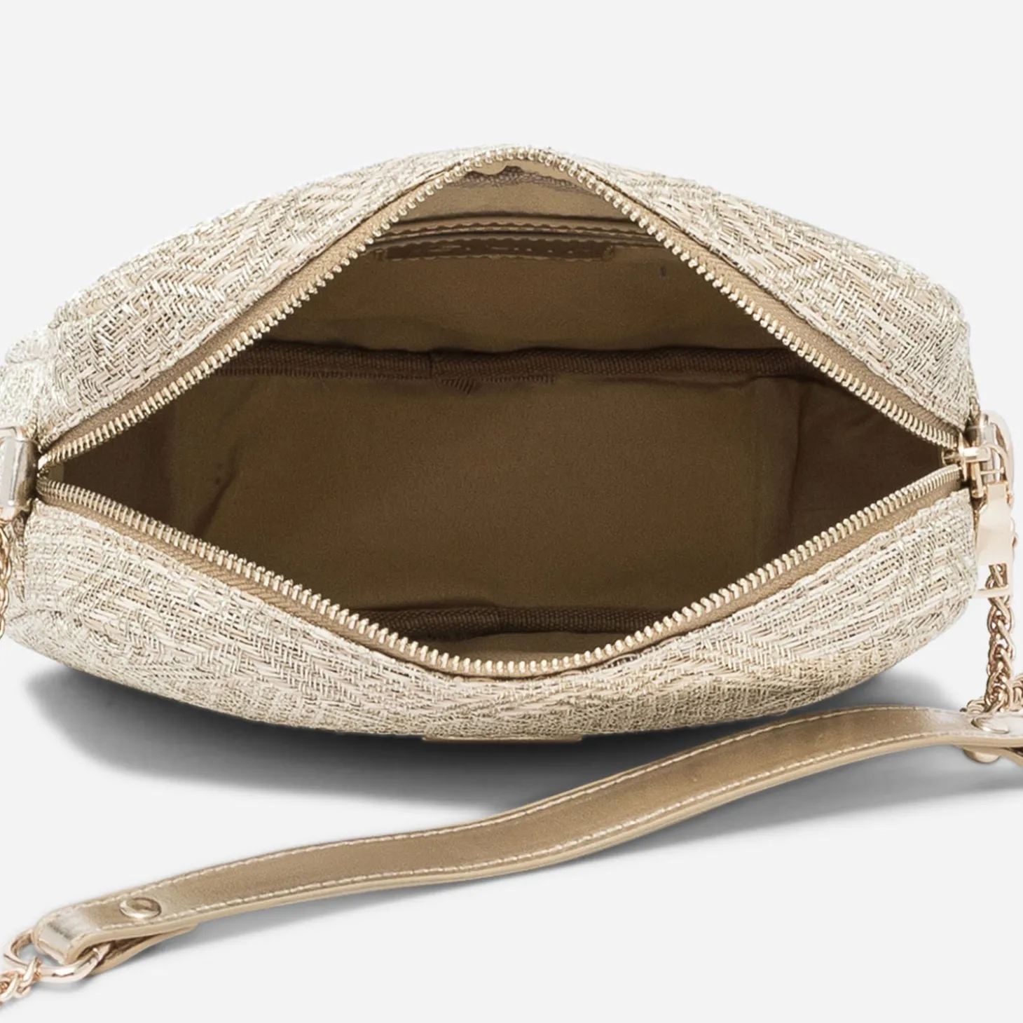 Ethnique et chic, c’est la définition du style de ce sac à main pour femme. Tressage beige rehaussé de fils dorés s’associent dans une parfaite harmonie. La bandoulière-chaînette apporte un côté glam’. Un modèle à porter sur l’épaule ou croisé, avec une tenue habillée.