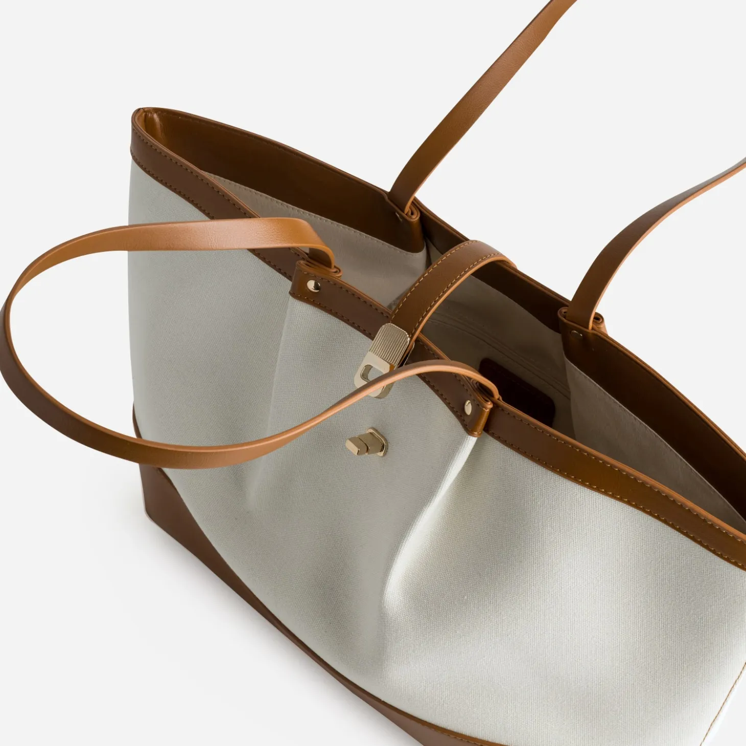 Sac cabas beige toile bi-matière cognac