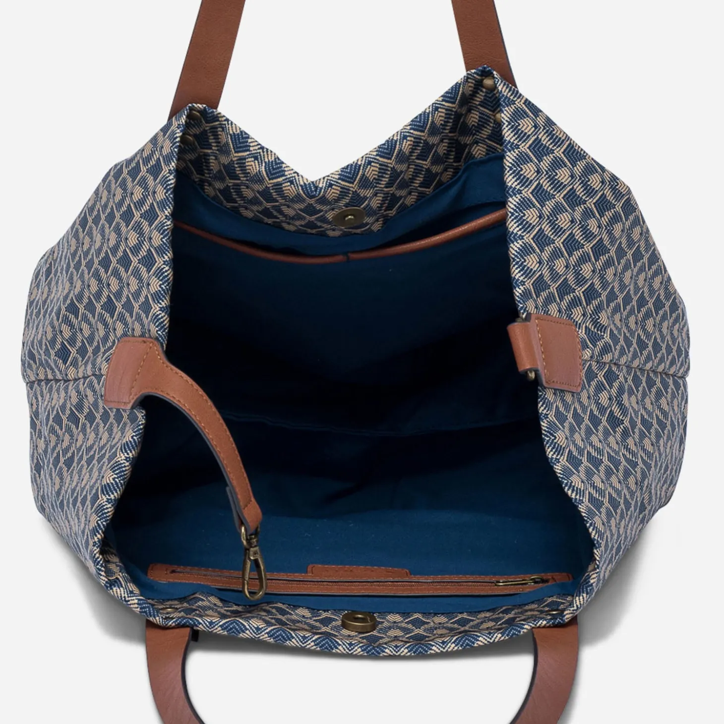Ce sac peut s’utiliser comme sac à main ou sac d’appoint, pour accompagner les femmes dans leur quotidien. En textile à dominante bleu, il se pare d’un bel imprimé minimaliste jaune. Les anses, les côtés et le zip de la poche externe, en matière synthétique camel, apportent du caractère. Un mousqueton intérieur permet de moduler le volume et les anses, un porté sur l’épaule ou le bras.