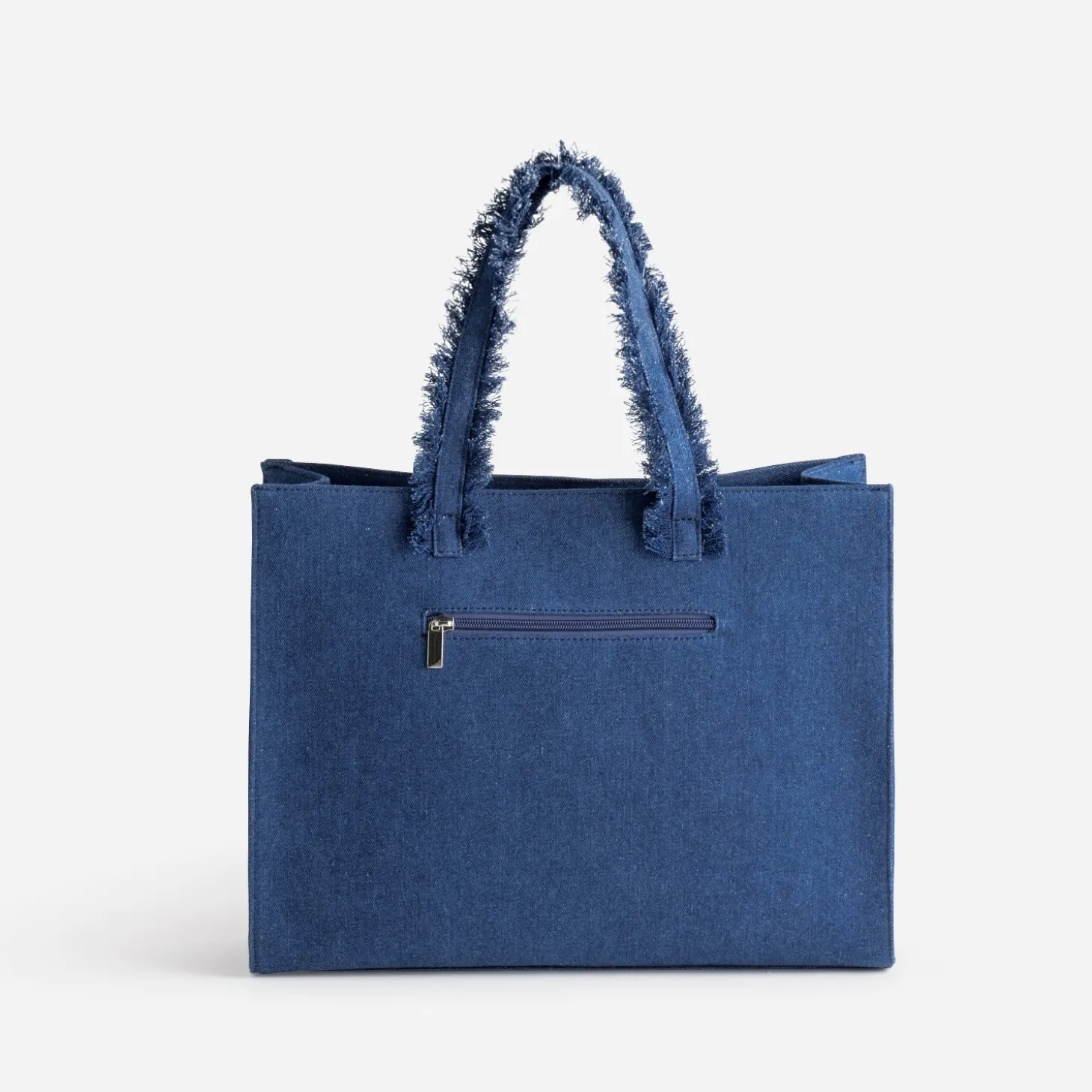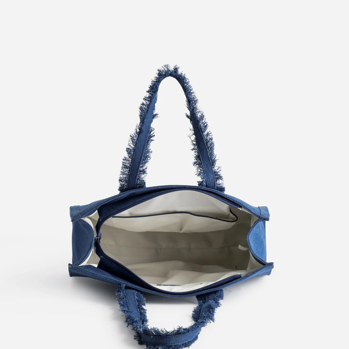 Dans la famille sac à main, demandez le cabas. Apprécié pour son maxi volume, il a su, au fil du temps, soulager le quotidien, pour finalement devenir bien plus qu’un sac à main. En textile bleu, inspiré par la célèbre toile denim, il se porte à la main, posé sur l’avant-bras ou sur l’épaule, grâce à deux larges anses, aux finitions frangées. Un modèle idéal, pour transporter les dossiers du bureau à la maison, sans déprécier votre style.