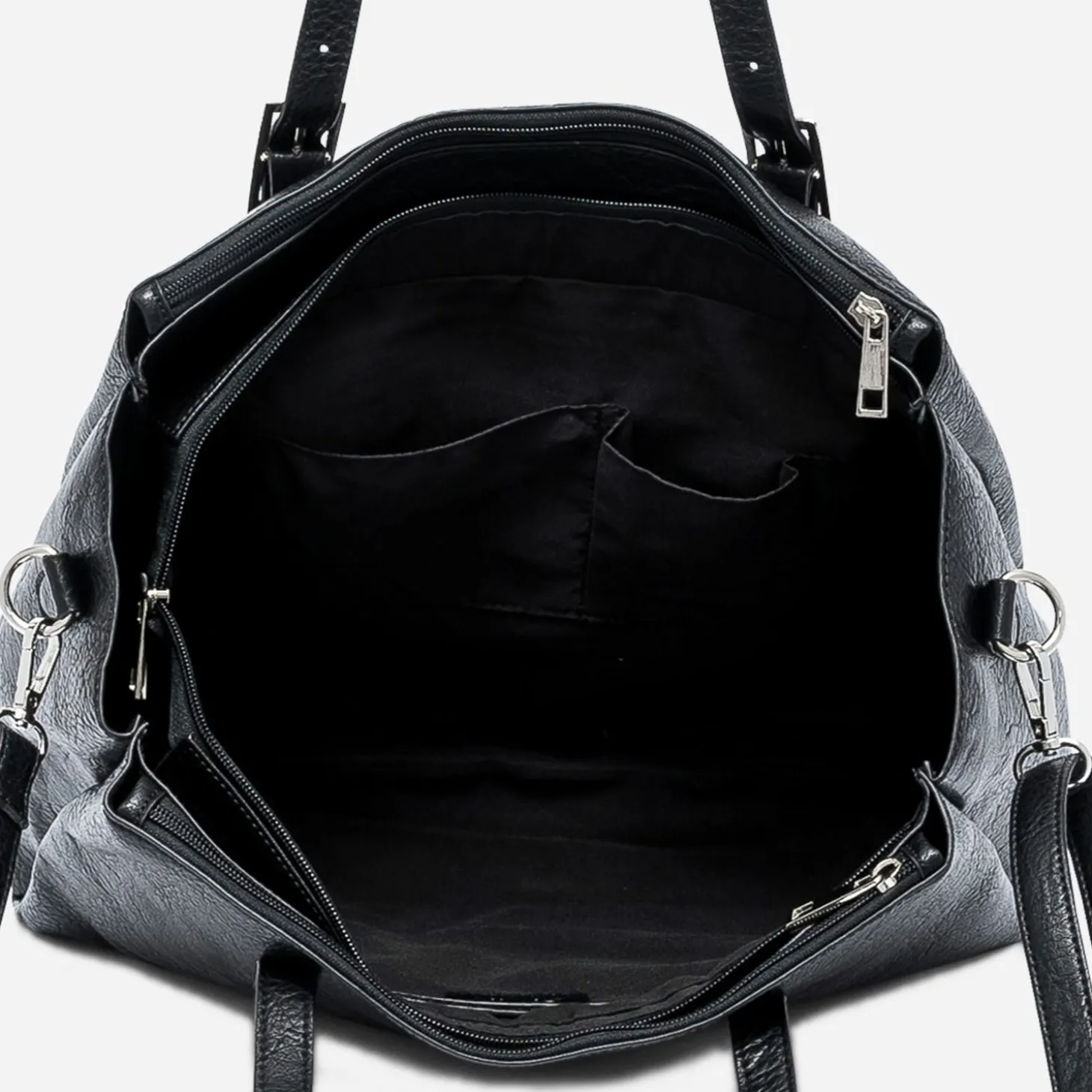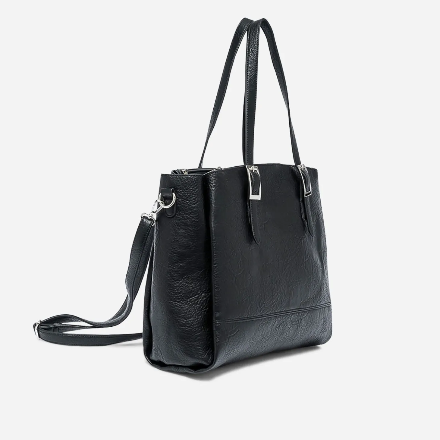 Avis à celles qui ont besoin de transporter affaires personnelles et affaires professionnelles au quotidien. Ce grand sac cabas noir est pensé pour ça. Il est doté de part et d’autre du compartiment principal, de 2 grandes poches zippées. 2 anses réglables permettent un porté sur l’épaule, doublé d’une bandoulière réglable et amovible, pour un porté épaule ou croisé. Un modèle facile à s’approprier.