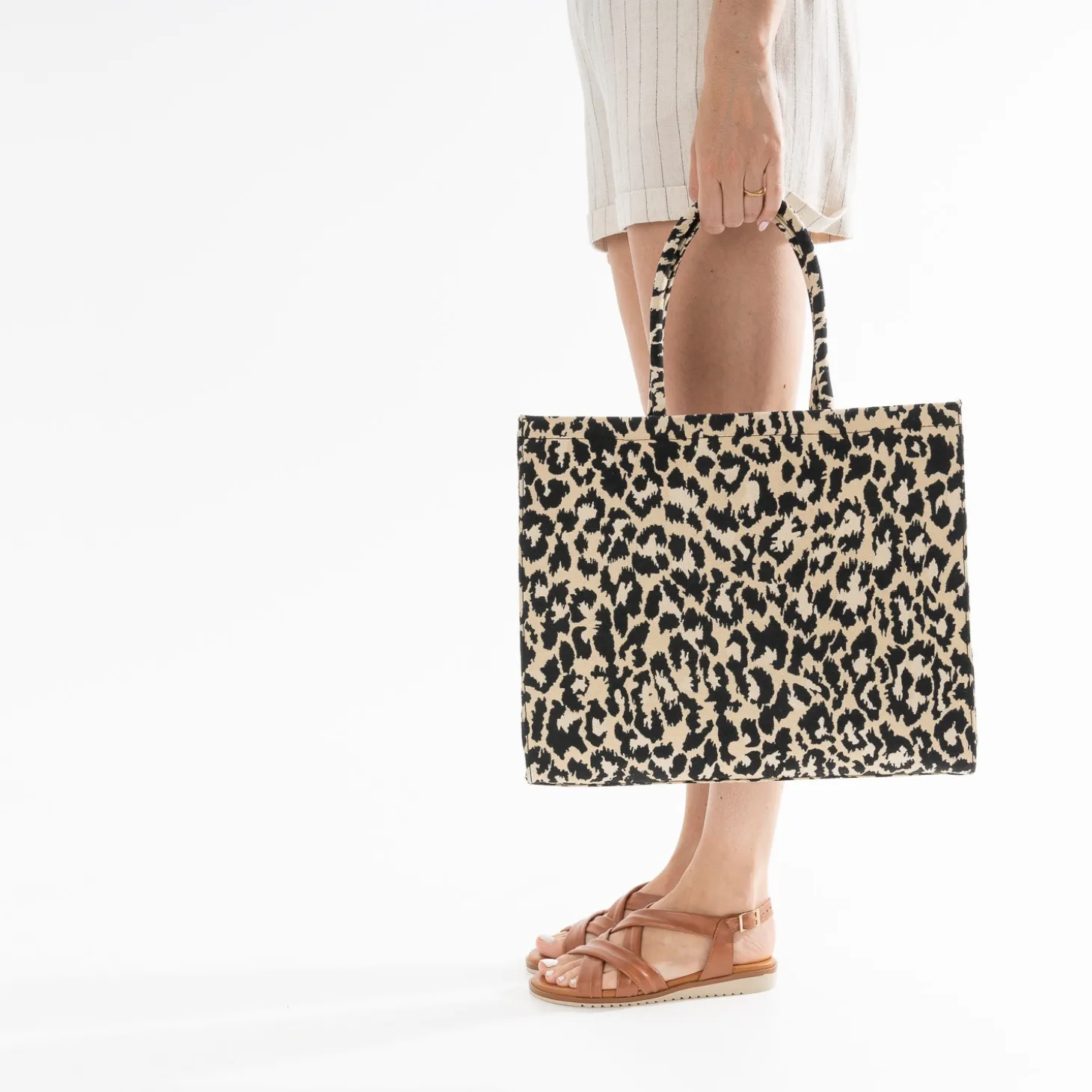 Confirmez votre envie d’évasion, avec un sac cabas digne de ce nom ! Animé d’un motif léopard noir, sur textile beige, il plaît pour son format idéal, pour transporter vos dossiers pro, ordi compris, comme vos affaires personnelles. Ses 2 anses se portent à la main, sur le bras ou sur l’épaule. Profitez-en pour sortir vos pièces en lin, dans les tonalités de blanc, beige, noir ou kaki.