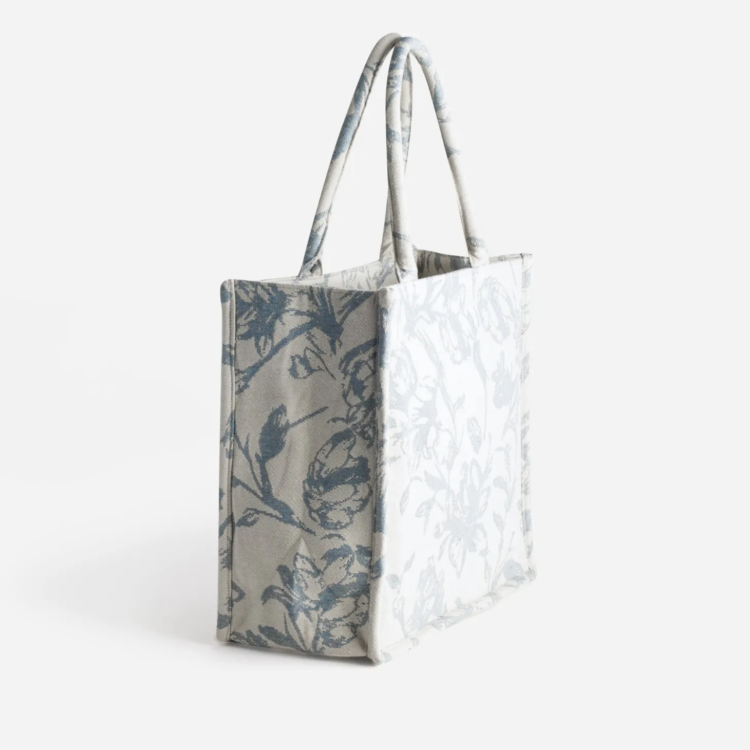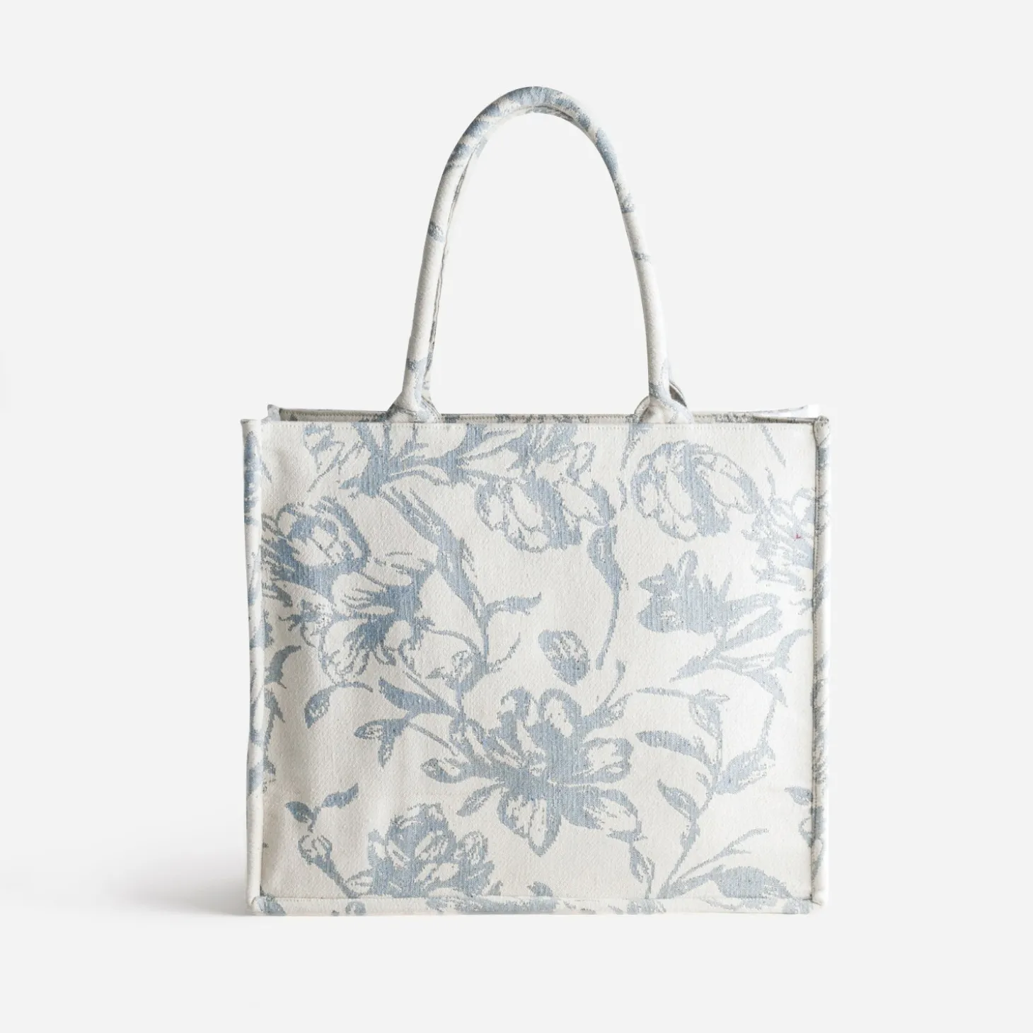 Les accessoires, aussi, varient en fonction des saisons. Le sac cabas s’offre un tissu jacquard beige, qui met à l’honneur un motif floral exclusif bleu ciel. Un modèle idéal au bureau, comme à la plage, pour transporter tous vos effets personnels.