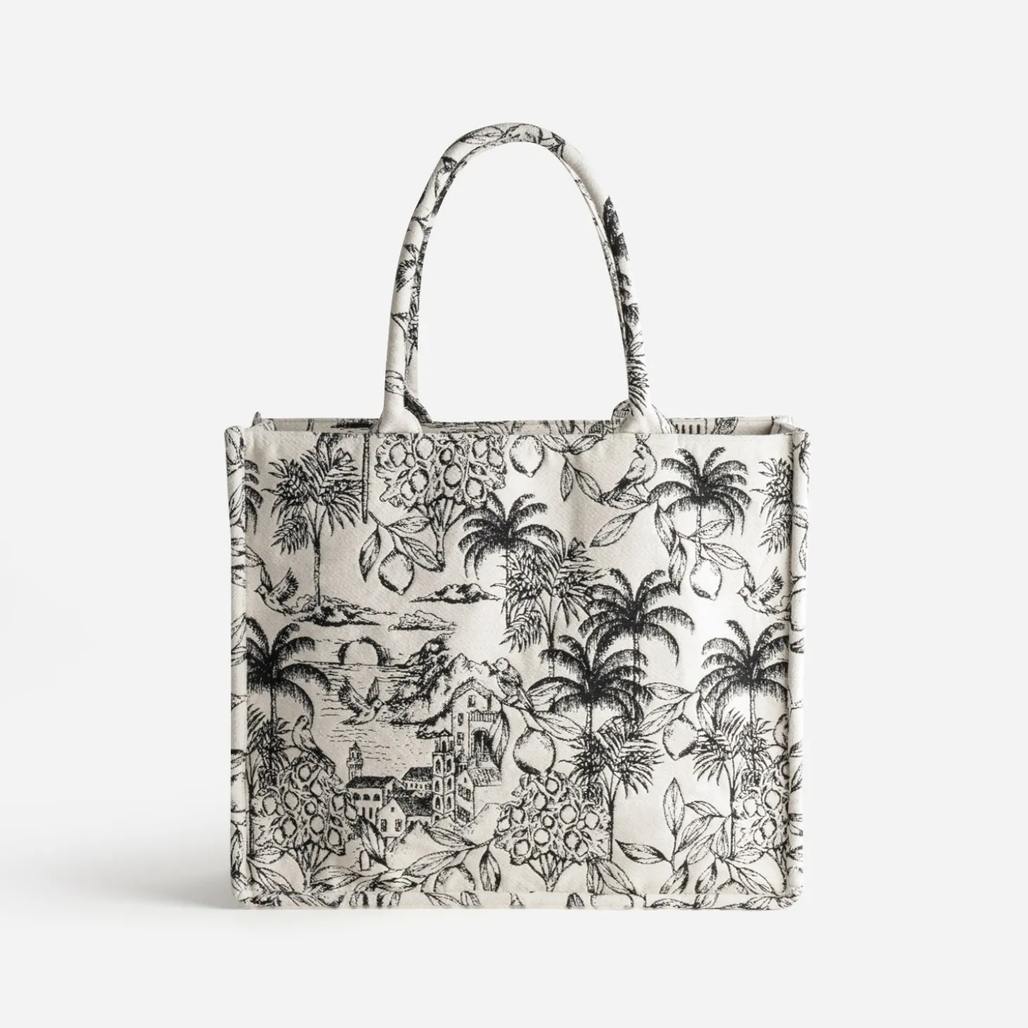 Voilà un cabas qui ne passe pas inaperçu. Imaginé pour contenir tous vos effets personnels, ce grand modèle est confectionné dans un tissu jacquard à motif villages, invitant oiseaux et feuillage, en coloris noir sur fond beige. Porté main ou épaule, il est idéal au quotidien. Le nouveau sac d’été à associer avec un look chic comme plus décontracté.