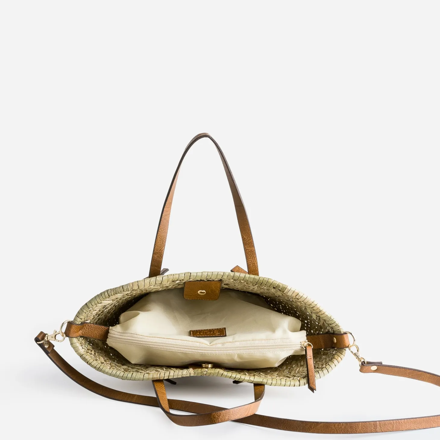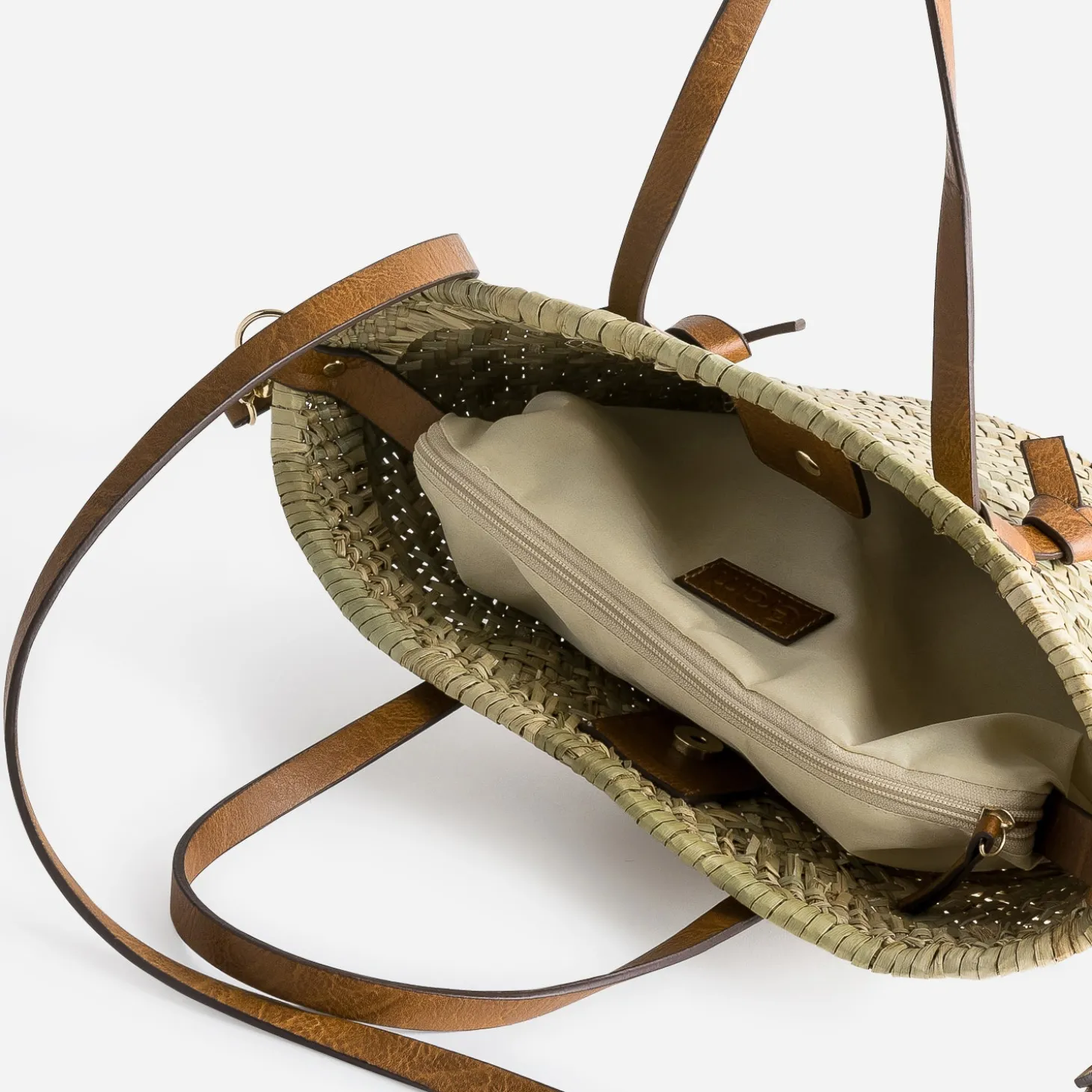 Essentiel mode ultime des beaux jours, le sac pour femme devient panier, dévoilant de multiples variations. En paille naturelle, il séduit par son tressage régulier, rehaussé de anses en matière synthétique camel, pour un porté à la main ou sur l’avant-bras. Il est livré avec une bandoulière assortie, réglable et amovible, pour un porté épaule ou croisé. Un it-bag à emporter avec soi tout l’été : à la plage, au marché, en bateau…