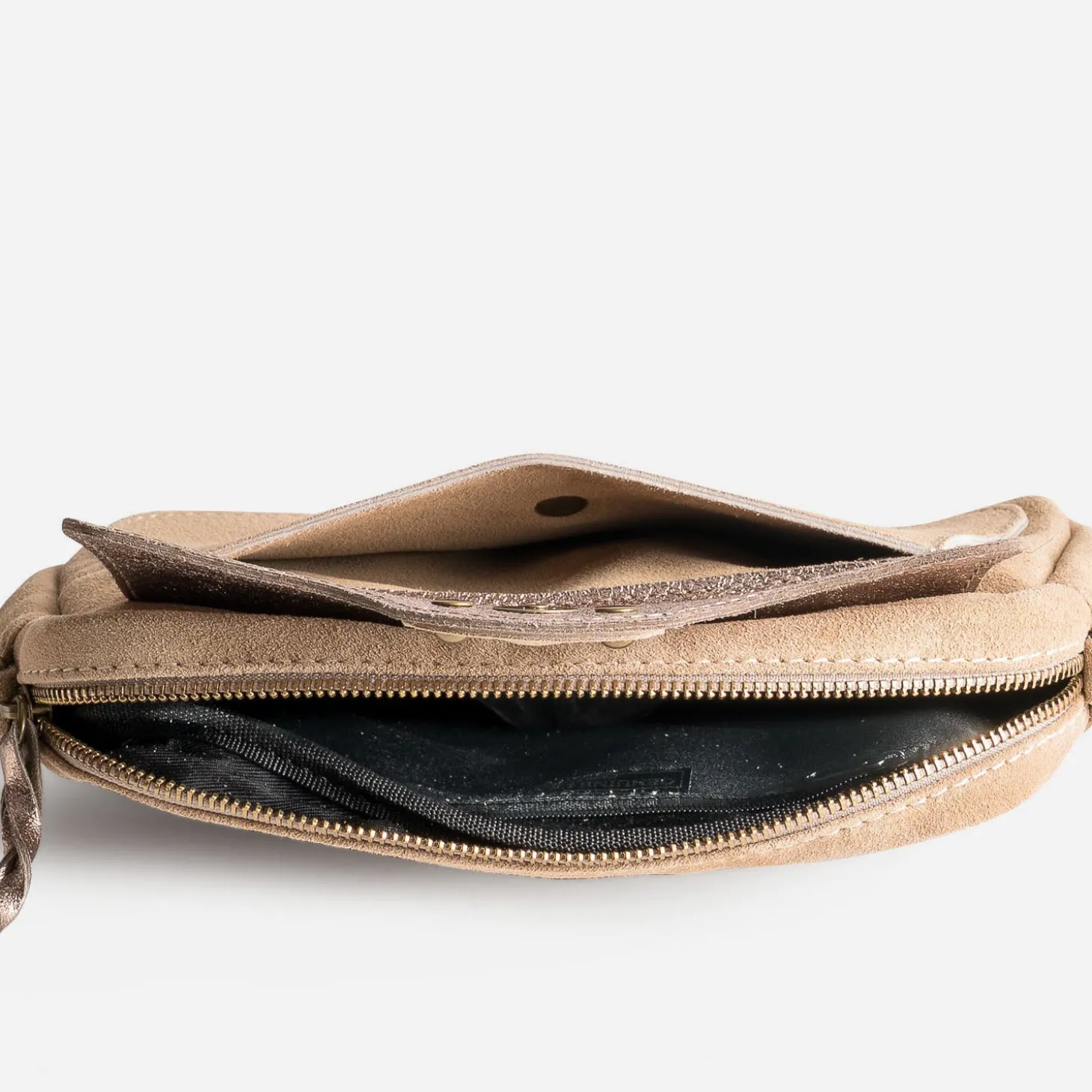 Dans la famille des sacs que l’on aimerait garder toute sa vie, et puis le transmettre, celui-ci se place en tête. Son format idéal, ni trop grand, ni trop petit, son cuir velours souple, son coloris beige, tout concorde, tout s’accorde. Devant, un rabat métallisé doré s’ouvre sur une poche plate, pensée pour accueillir clés et téléphone avec facilité. Un modèle à porter autour du buste, pour garder les mains libres, et donc une certaine liberté.