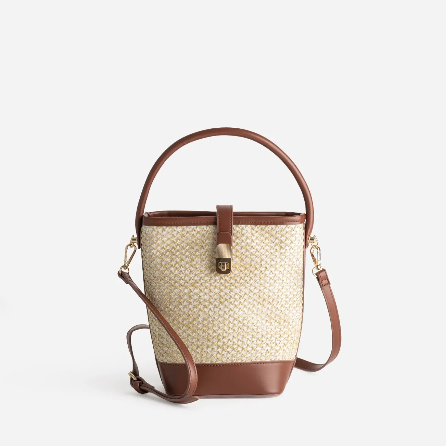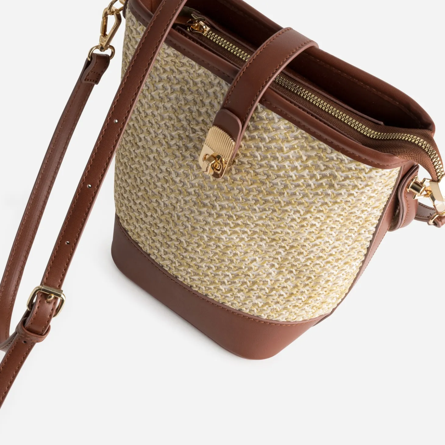 Caractérisé par une forme cylindrique, une ouverture par le haut et une fermeture coulissante grâce à un cordon de serrage, le sac seau est un accessoire intemporel. Modernisé par une paille papier beige clair, soulignée de matière synthétique lisse camel, il se ferme, ici, par un zip, doublé d’une patte maintenue par un tourniquet. Anse courte, bandoulière réglable et amovible, il se porte aussi bien à la main, que sur l’épaule ou croisé sur le buste. Un modèle à imaginer avec un tailleur en lin, de couleur clair, et des mocassins en cuir camel.