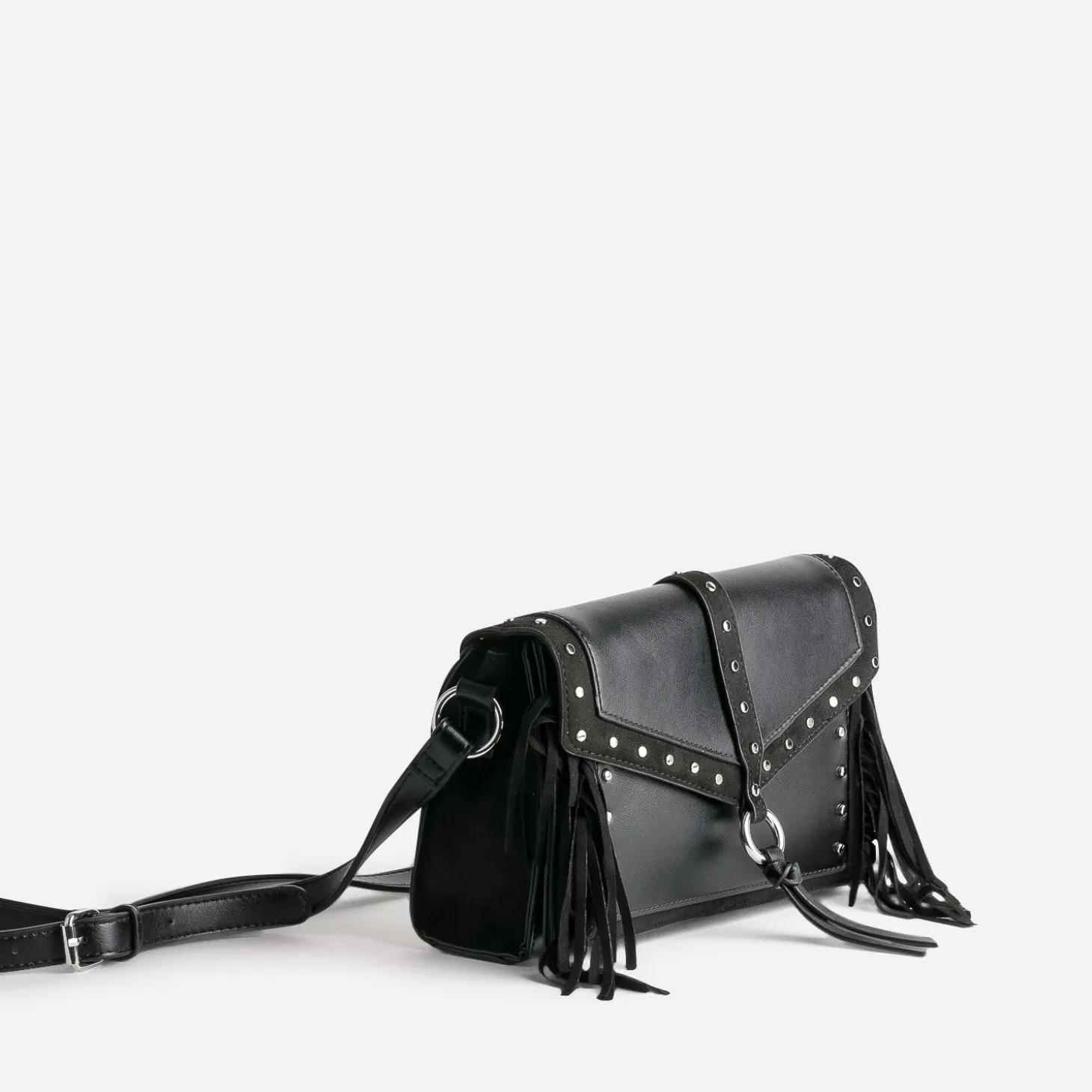 Envie de finaliser votre look d’une touche rock ? Misez sur les accessoires ! Ce sac à main pour femme se décline en coloris noir. Les matières synthétiques mixent les effets lisses et suédés, et les détails sont étudiés : clous et franges décorent le rabat et les côtés. Les deux compartiments sont renforcés par des poches externes et internes, pour optimiser le rangement. Un accessoire tendance, à porter sur l’épaule ou croisé sur le buste.