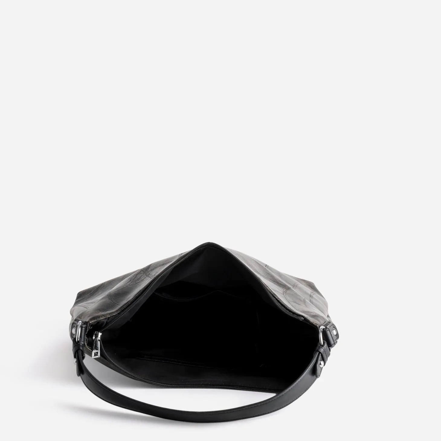 Les atouts de ce sac à main ? Ils sont nombreux. D’abord son volume, relativement grand. Ensuite, son coloris noir, intemporel. Enfin, sa matière synthétique souple, revisitée par un effet patchwork patiné inédit. Sans oublier son porté épaule, grâce à une bandoulière courte. Un accessoire qui ne manque pas de style, avec un long manteau noir ceinturé, un costume et une paire de derbies dorés.