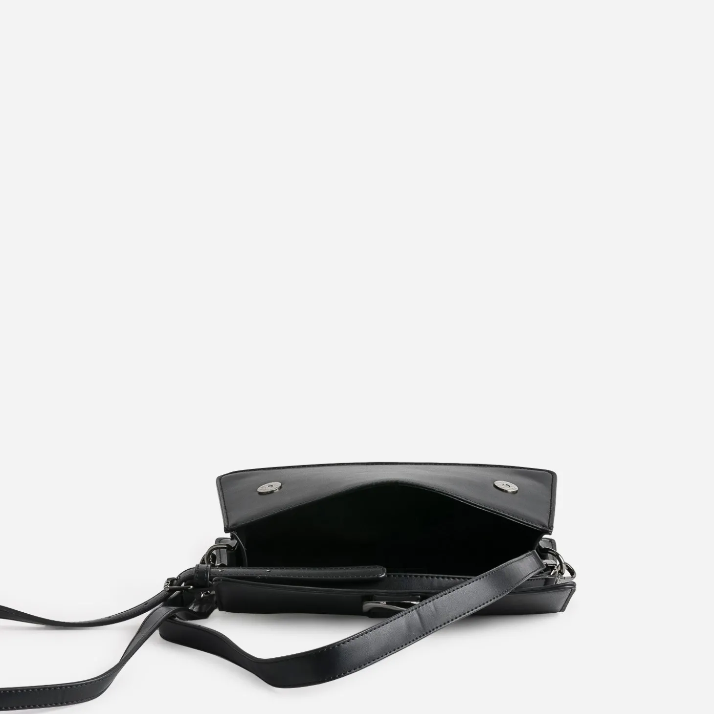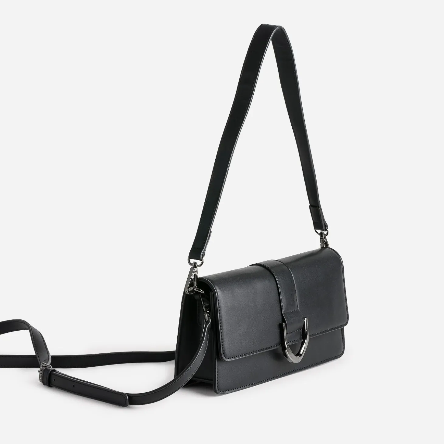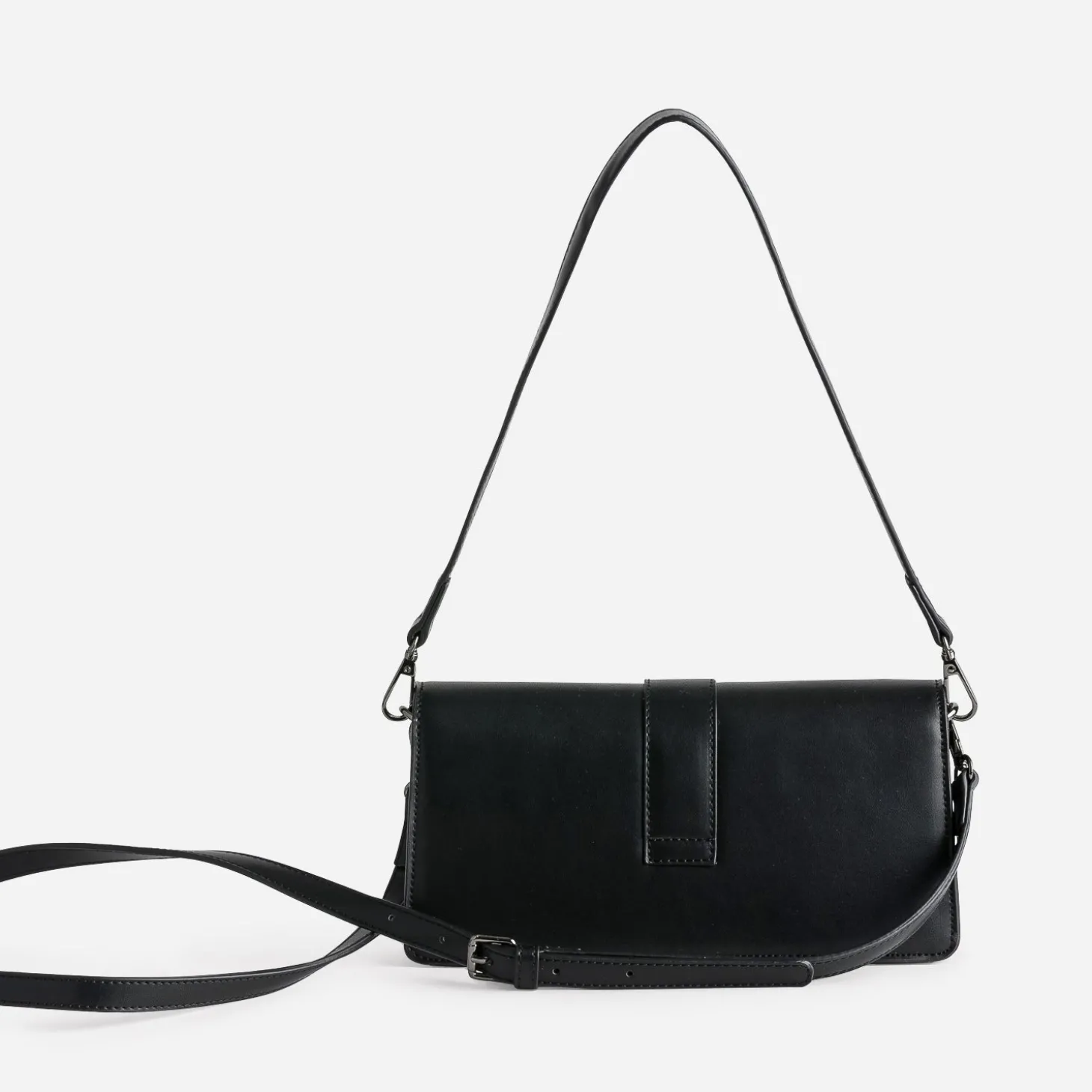 Ce sac à main pour femme marque par son élégance. Rigide, sur un format rectangulaire, il est confectionné en matière synthétique, et se décline en coloris noir. Le rabat est décoré d’une large bride, finalisée par une boucle fantaisie en métal gun. Son atout, ce sont ses deux bandoulières, l’une courte, l’autre plus longue et réglable, pour ajuster les portés, sur l’épaule ou croisé. Imaginez-le avec une chemise à plastron volanté et une mini-jupe en jean gris, avec des socquettes blanches et une paire de mocassins en cuir noir.