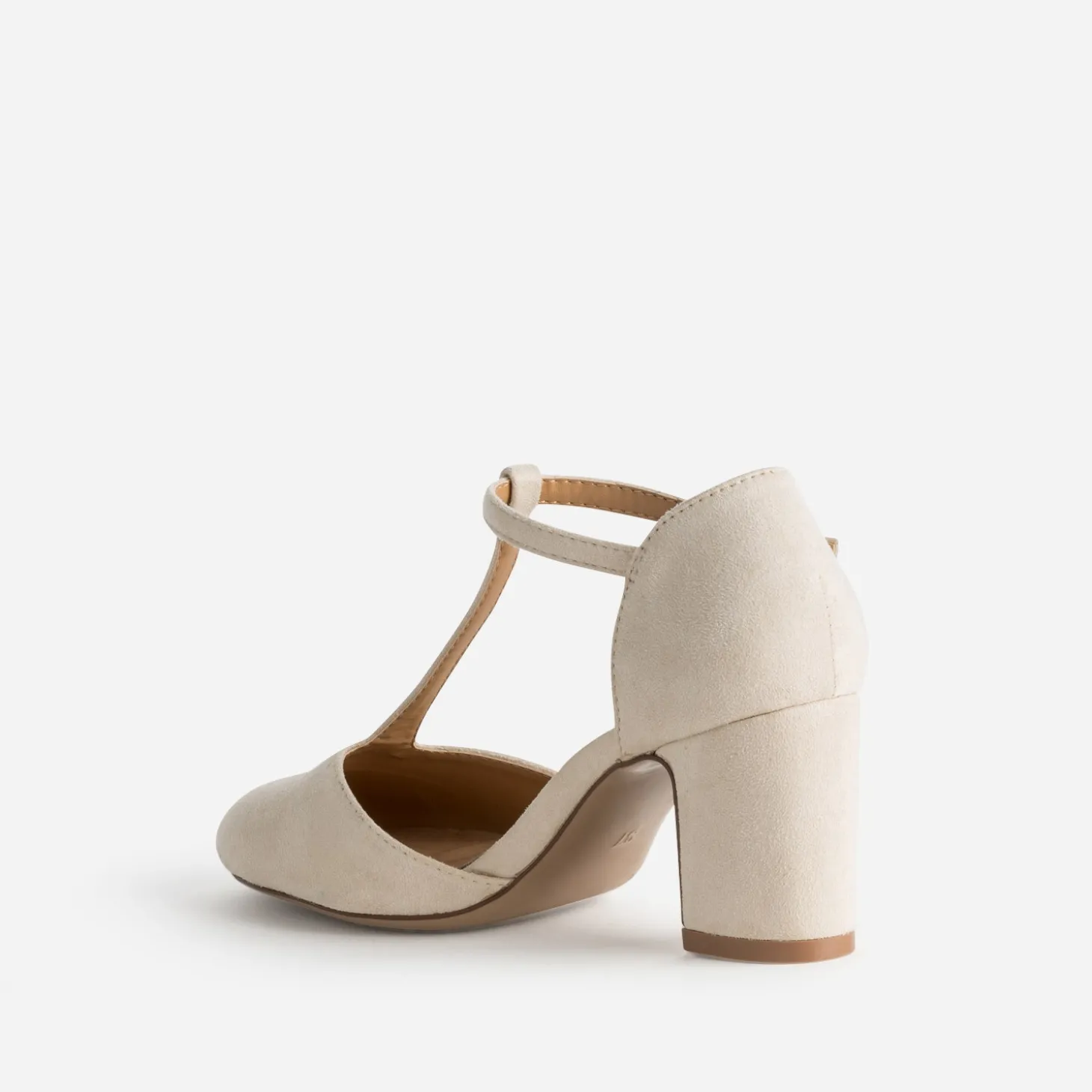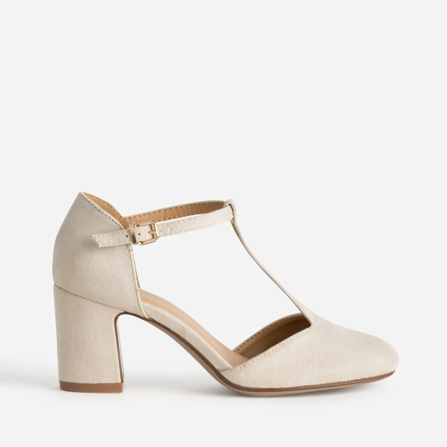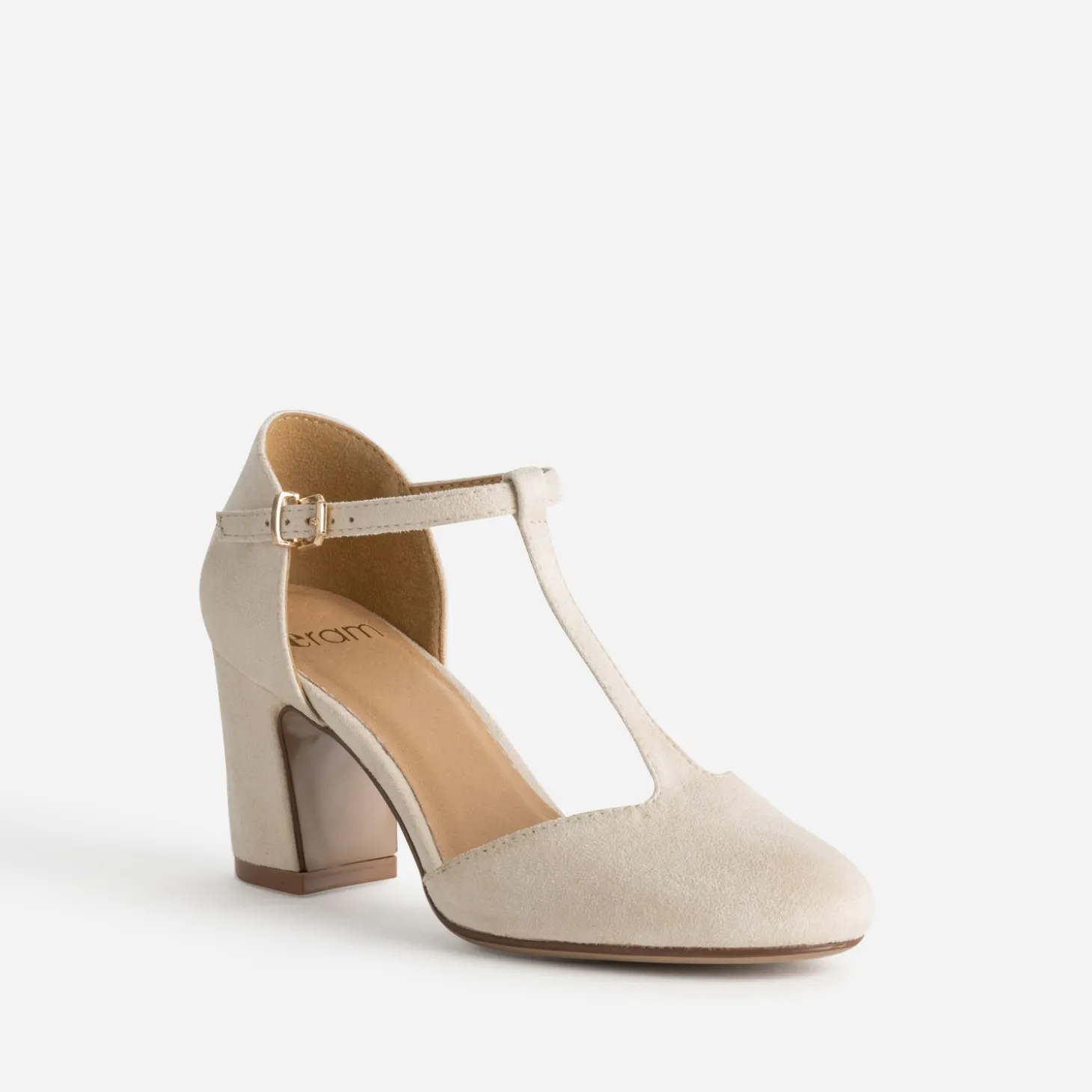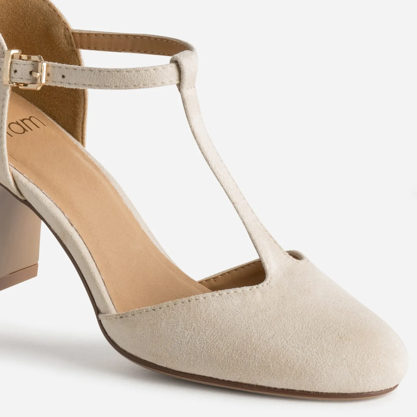 Allure rétro intemporelle pour ce salomé pour femme. En textile suédé, il se décline en coloris beige, très sobre. Monté sur un talon de 7 cm, son design spécifique est reconnaissable à sa bride en T, posée sur le dessus du pied. Un modèle à twister avec un top écru et une jupe longue portefeuille rose poudré.