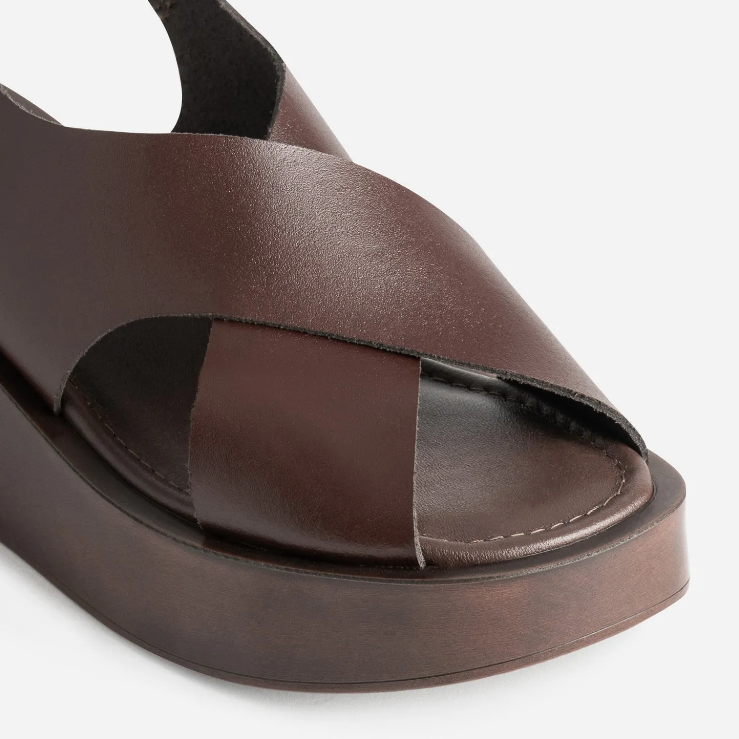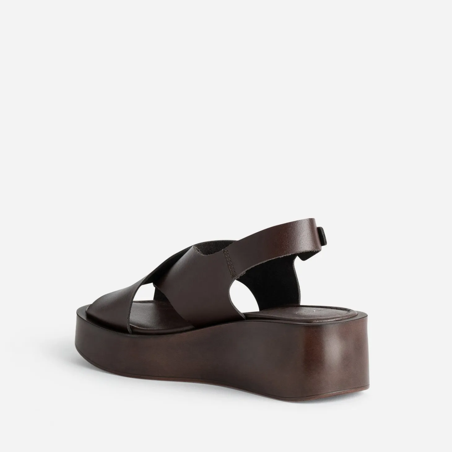 Un confort indéniable, un style remarquable. La sandale pour femme n’a pas fini de vous surprendre. Deux larges brides en cuir lisse enveloppent le pied, posé, lui, sur une semelle à plateforme et légèrement compensée. Et son coloris marron foncé ? Une évidence, pour composer des looks élégants au quotidien. Un modèle à privilégier avec une robe chemise midi kaki et des bijoux dorés, avec un débardeur parme et un pantalon large prune.