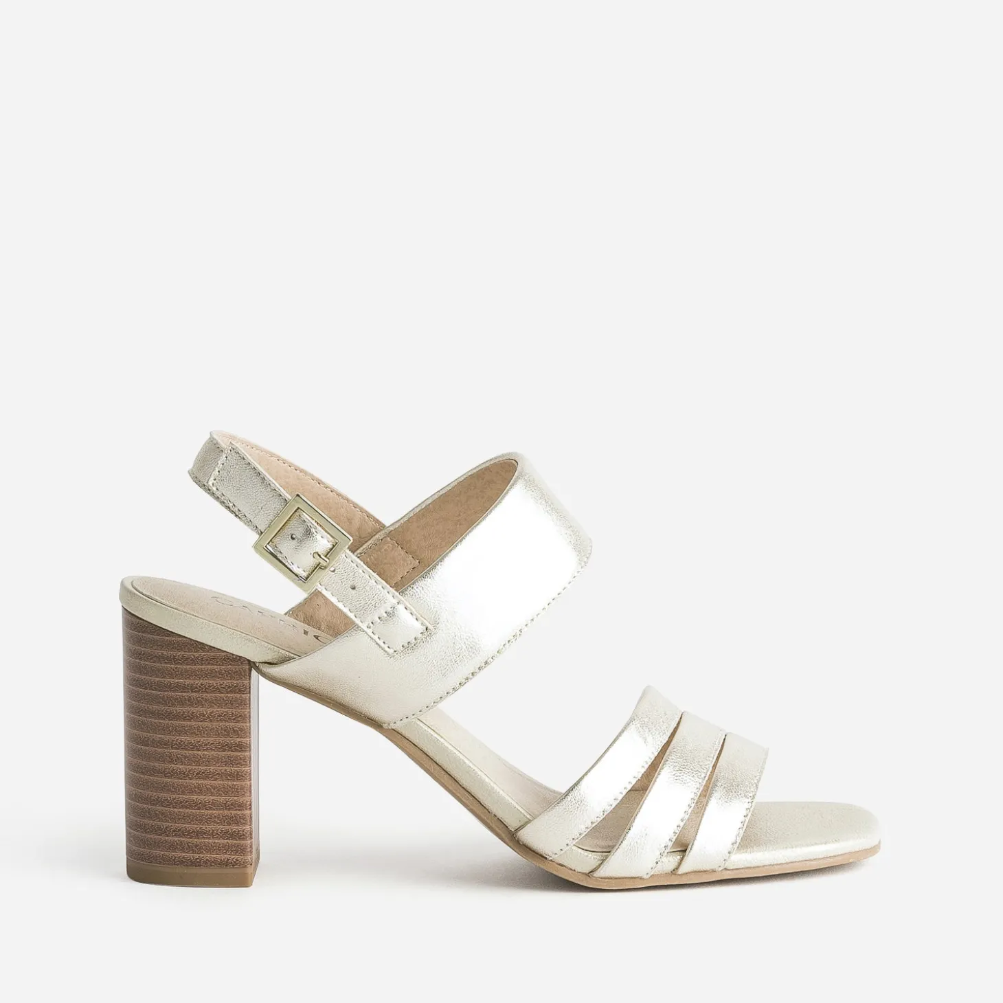 Et si vous vous laissiez surprendre par la sandale à talon ? Confectionnée en cuir lisse, elle se décline en coloris doré. Son talon de plus de 8 cm gagne résolument en confort grâce à une semelle moussée. Un modèle à réserver pour une belle occasion, avec, pourquoi pas, un tailleur-pantalon.