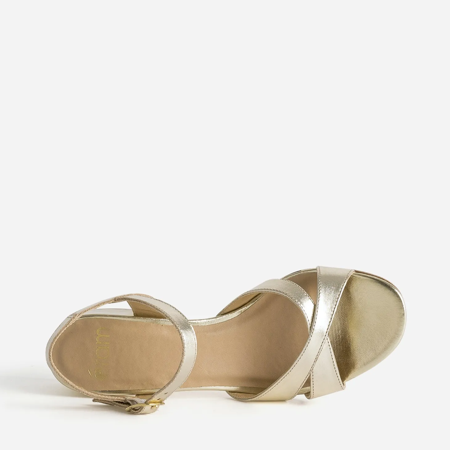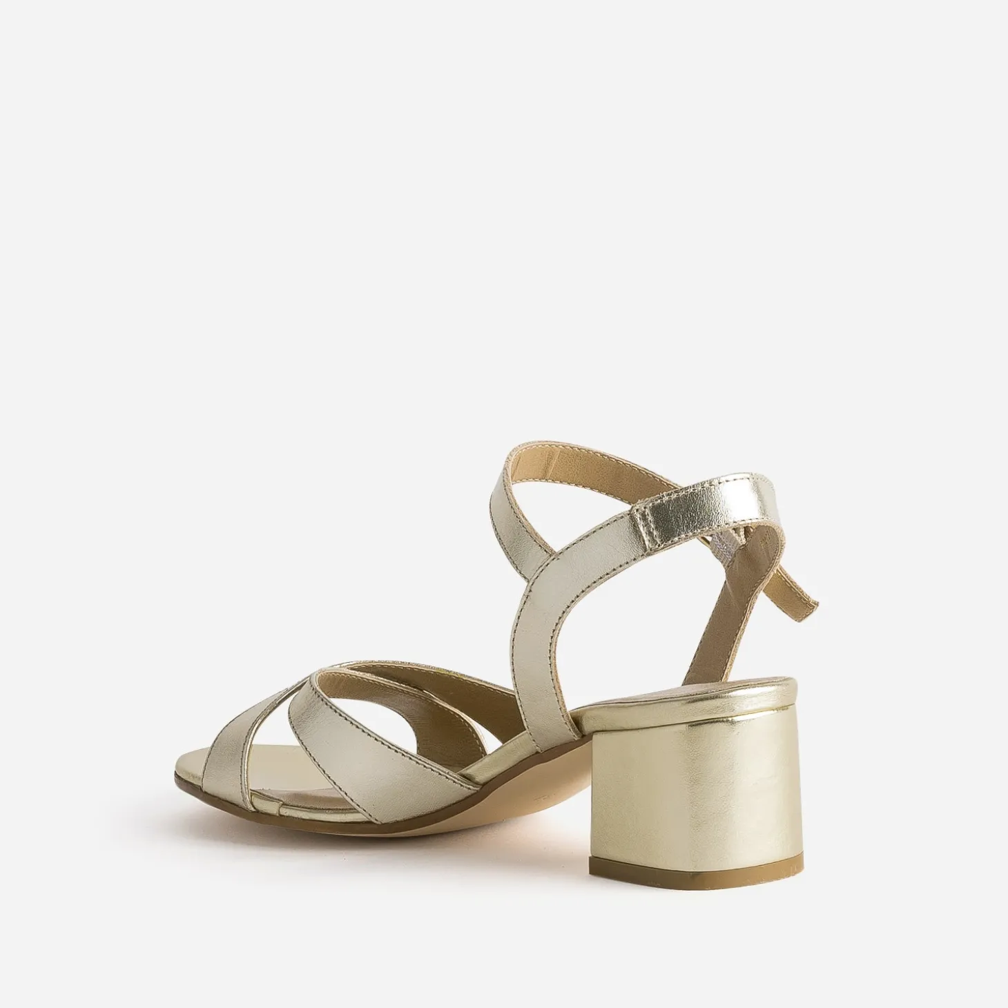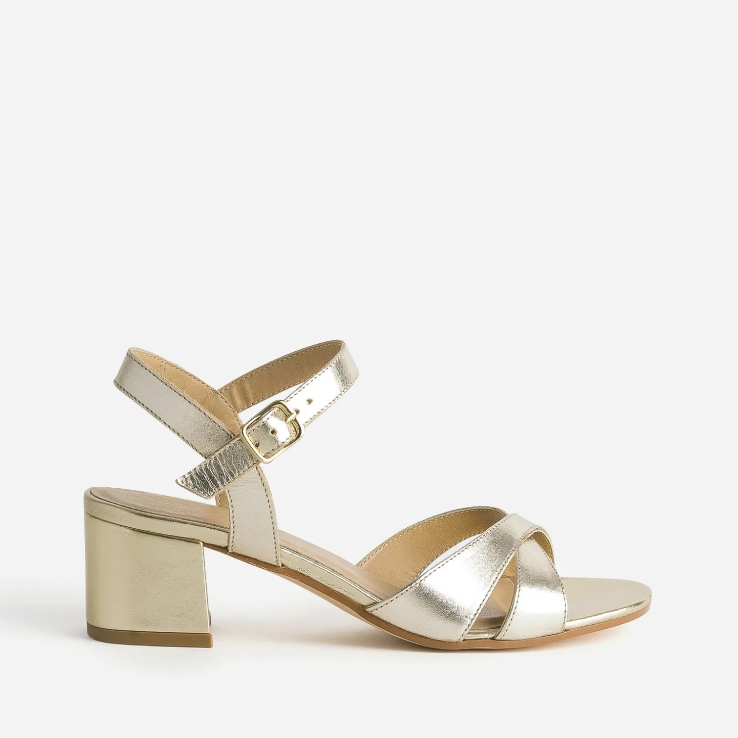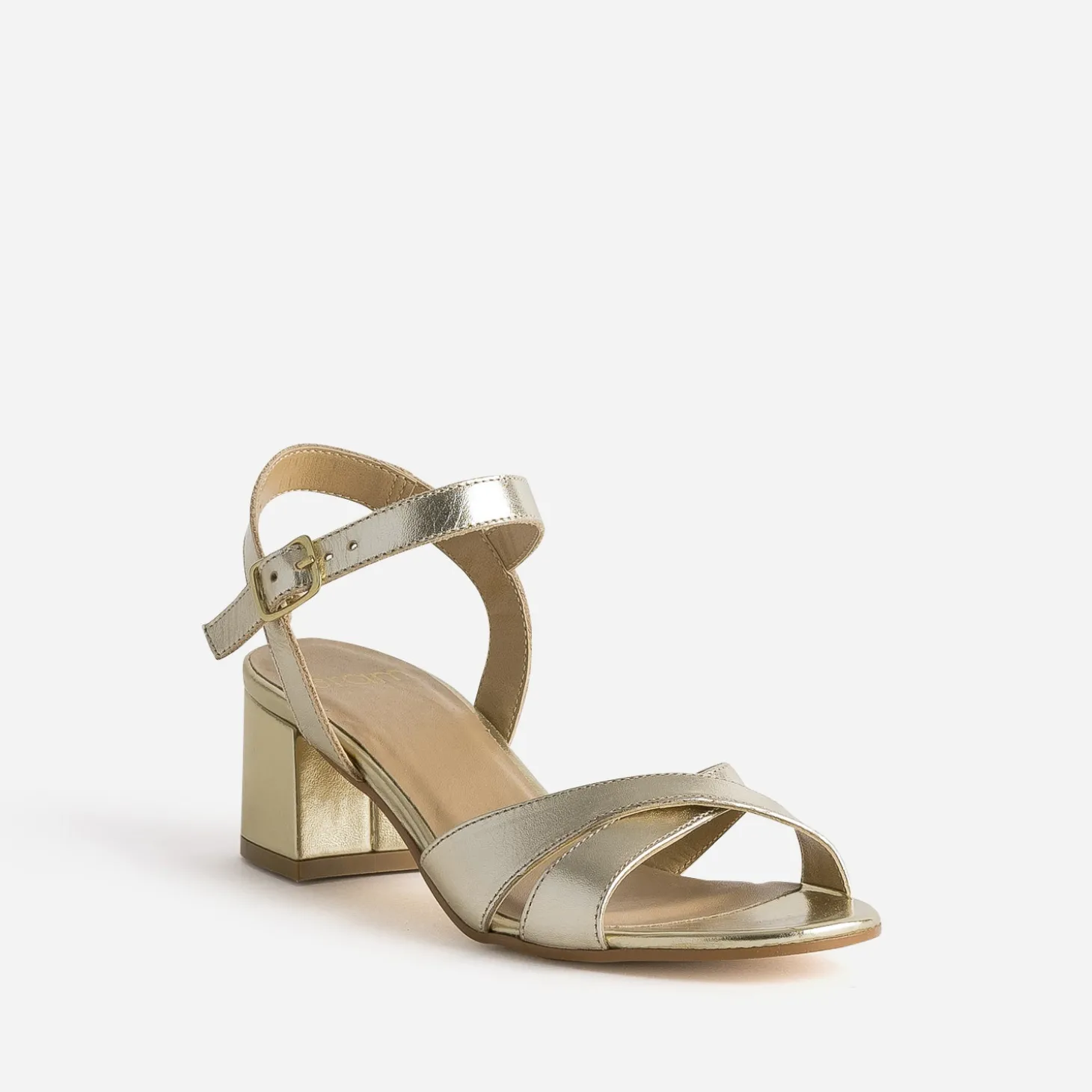 Cette sandale femme frôle la perfection. En cuir doré, du bout du pied, jusqu’au talon, elle est montée sur un talon flare de 5 cm, ni trop haut ni trop plat, avec brides croisées. Avec un T-shirt blanc et un jean droit cropped en journée, avec une robe longue noire, en soirée, elle s’impose comme un incontournable que vous allez adorer porter tout au long de la saison.