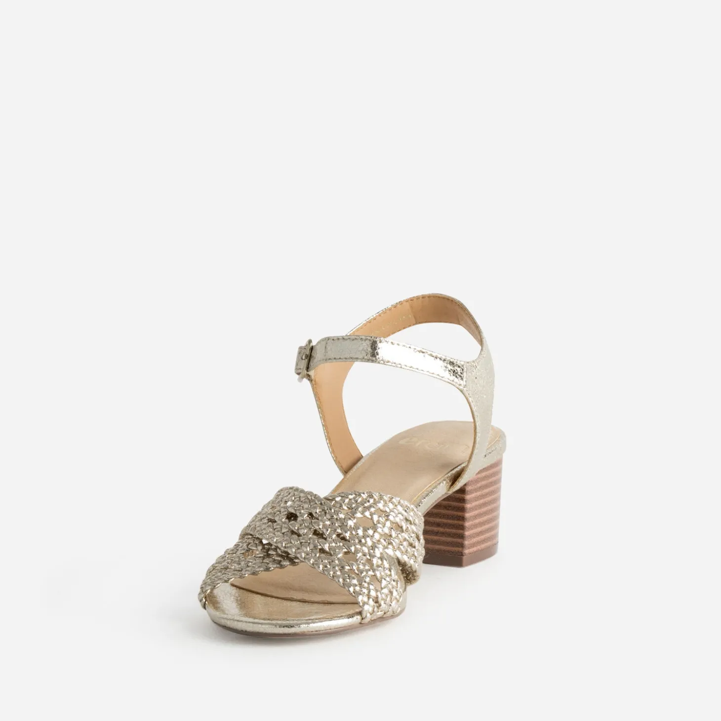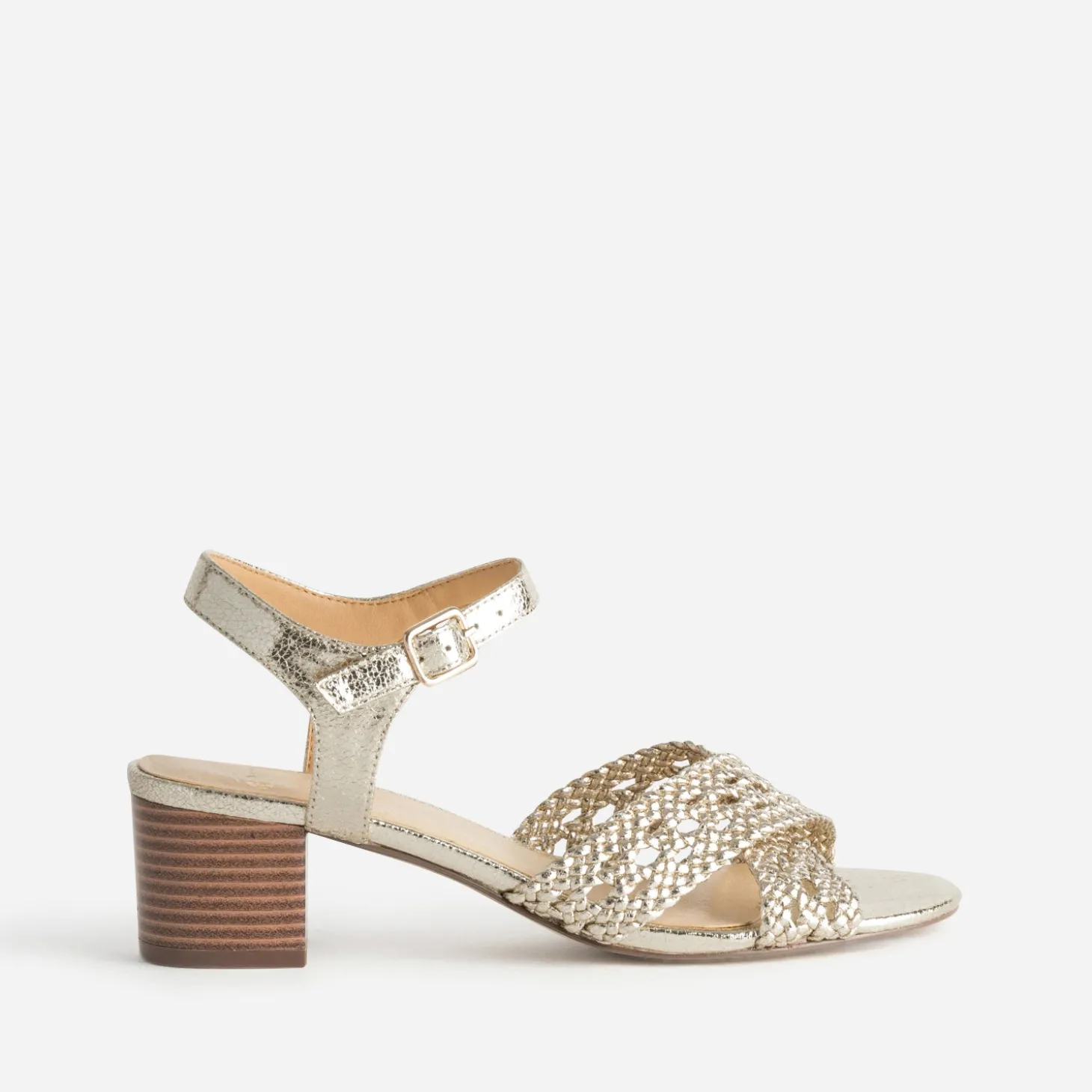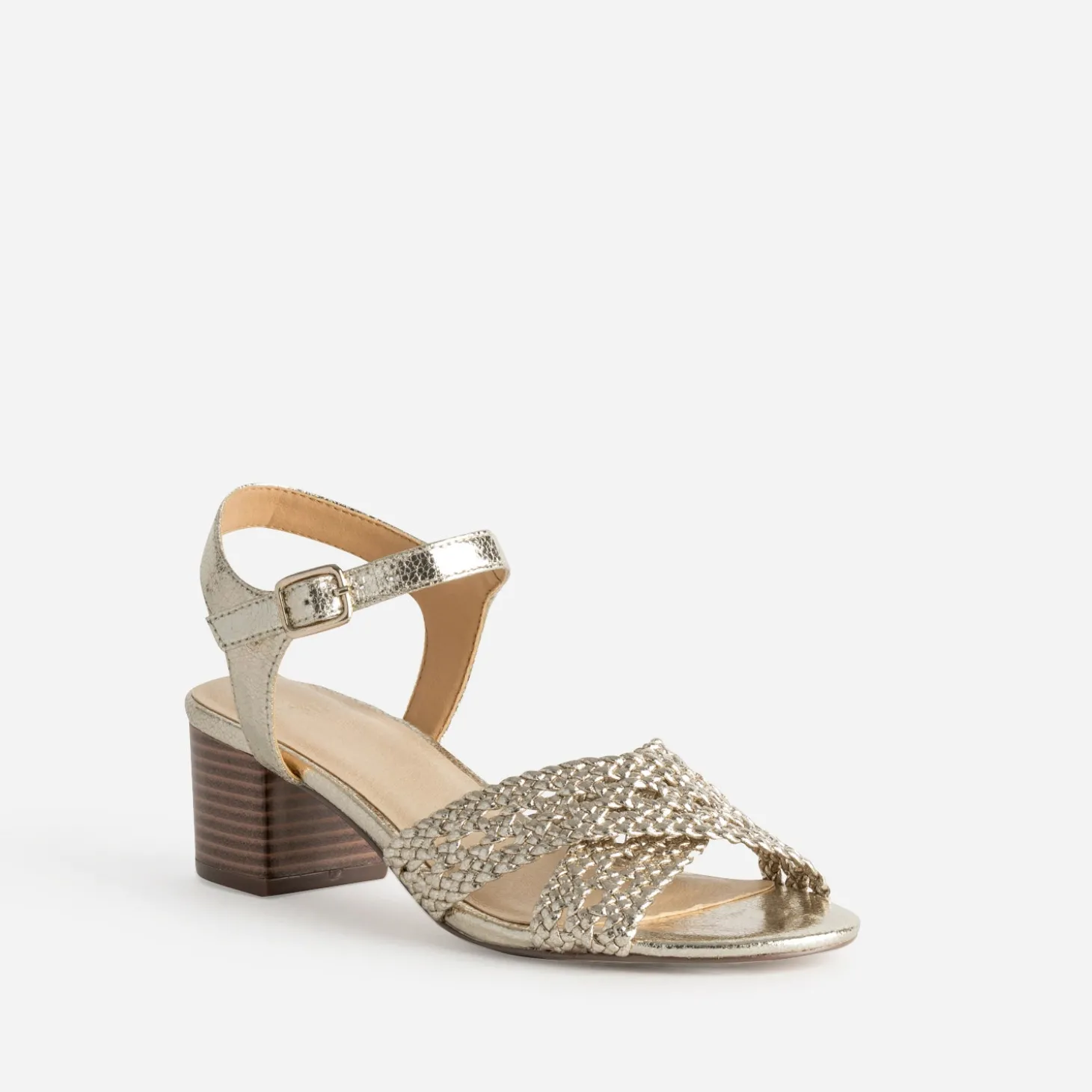 Le look bohème chic fait la part belle aux détails, et notamment les jeux de tressage. Cette sandale à talon pour femme l’illustre parfaitement par une matière synthétique métallisée dorée. Montée sur un petit talon lamellé effet bois, elle maintient le pied par des brides croisées sur le pied et autour de la cheville. Un modèle sublime pour mettre en valeur toutes les robes d’été, qu’elle soit noire et forme chasuble, blanche avec plastron volanté ou vert irisé forme tube.