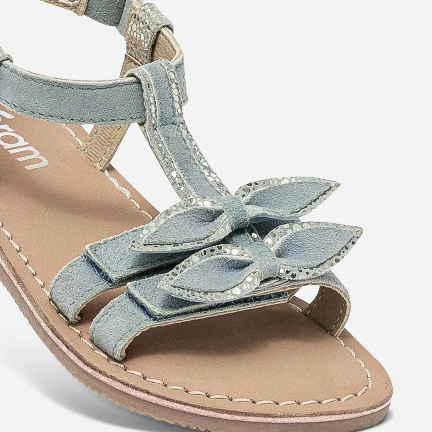 Plongez dans l’été avec cette sandale petite fille, couleur du ciel. En cuir velours, elle se pare de touches imprimées argentées, qui reflètent la lumière. Les 2 brides posées sur le pied sont décordés de nœuds fixes et se ferment par scratchs, tout comme celle à l’arrière de la cheville. Un modèle à associer avec des tons pastel, comme le rose tendre ou le jaune pâle.