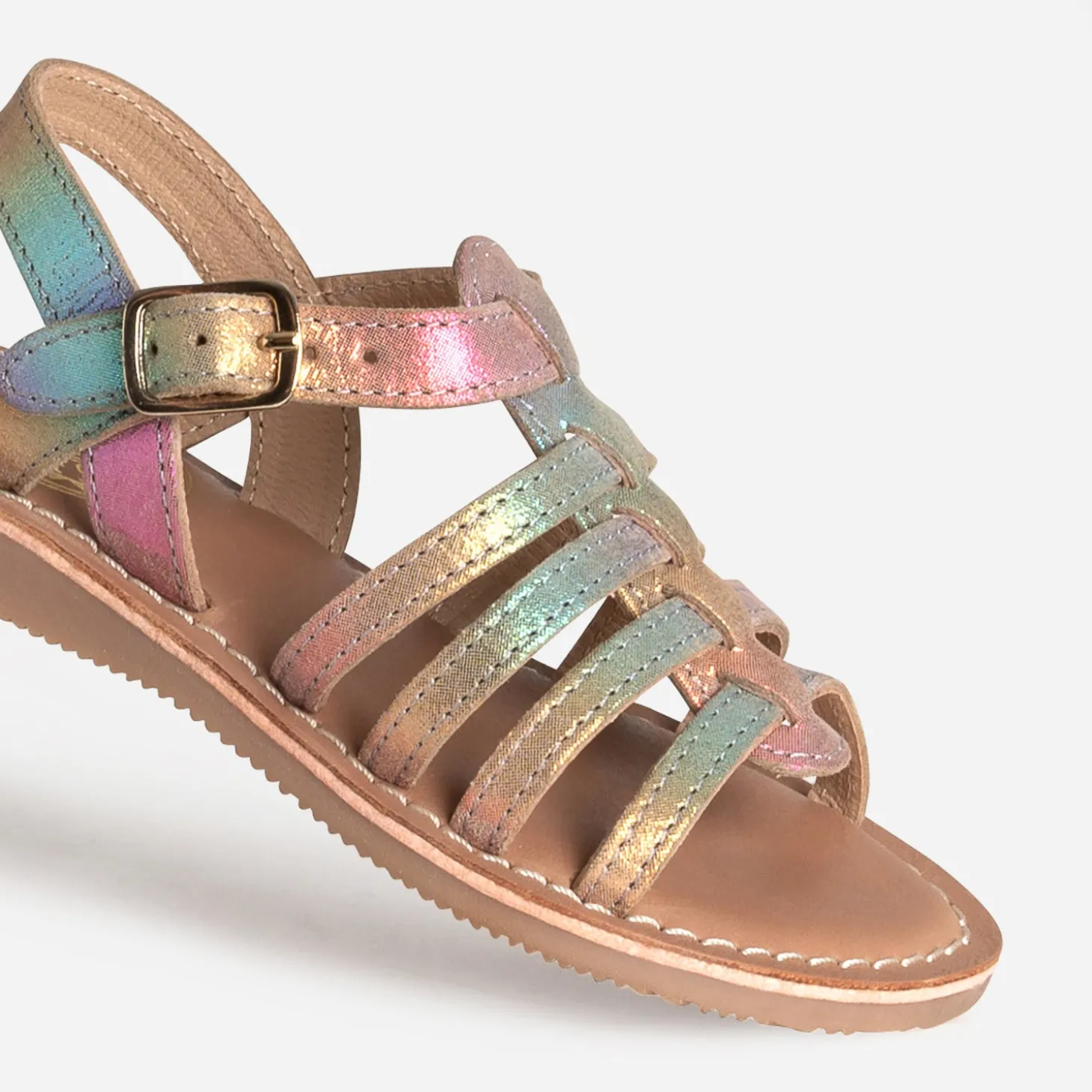 Cette sandale pour petite fille séduit par son jeu de multi brides. En cuir, elle s’autorise un jeu de couleurs inspiré de l’arc-en-ciel ou des licorne, avec, en plus, une finition irisée. Un modèle très mode, qu’elle va forcément adorer.