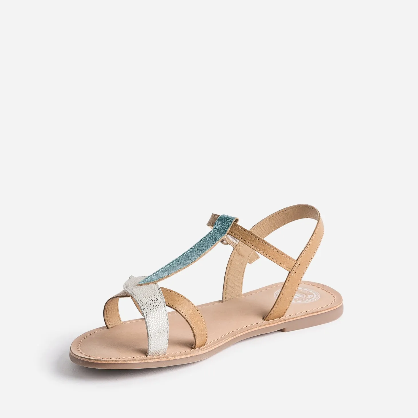 Esprit bohème chic pour cette sandale junior fille. En cuir camel, elle présente deux feuilles en guise de brides, l’une beige à motif argenté, l’autre turquoise pailleté. A réserver pour une cérémonie comme pour le quotidien.