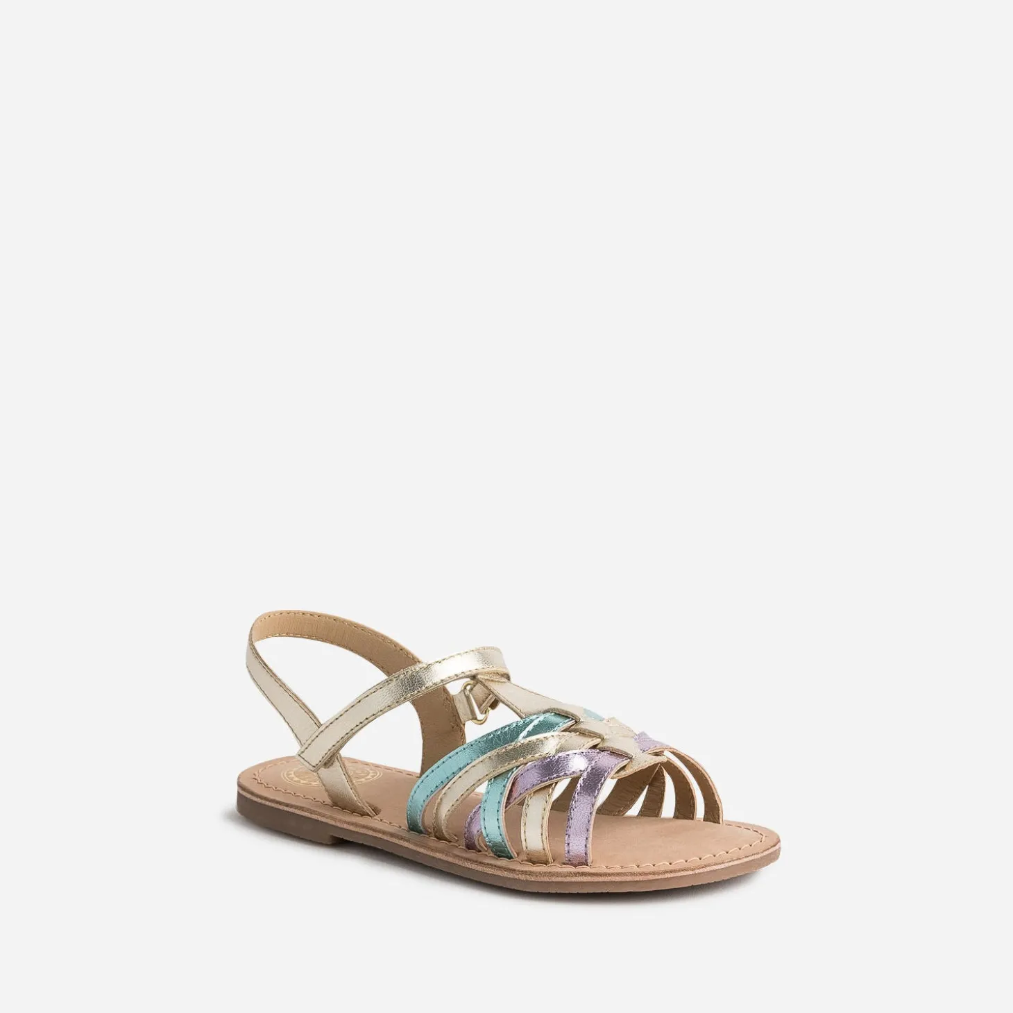 Le cuir métallisé a le pouvoir de sublimer chaque tenue d’une touche chic ; il habille cette sandale pour fille, dans les tons de doré, parme et vert, dans une belle harmonie. La fermeture par scratch facilite l’autonomie et permet ajustement, confort et maintien du pied. Un modèle à choisir pour une cérémonie, et à porter tout au long de la saison.