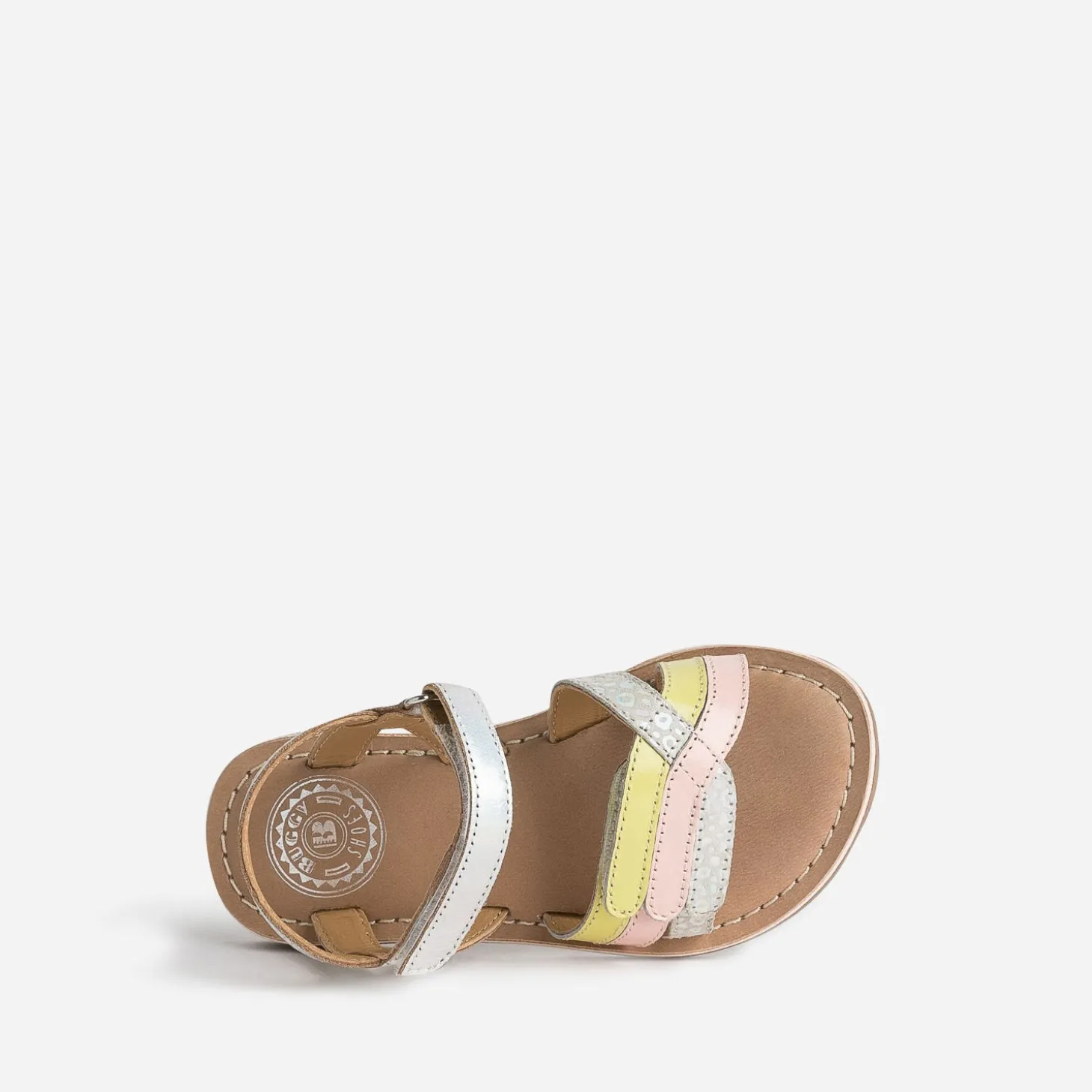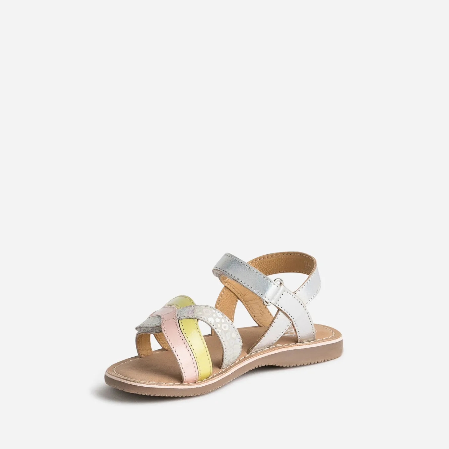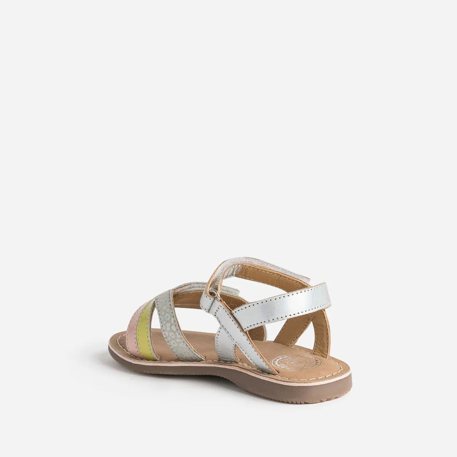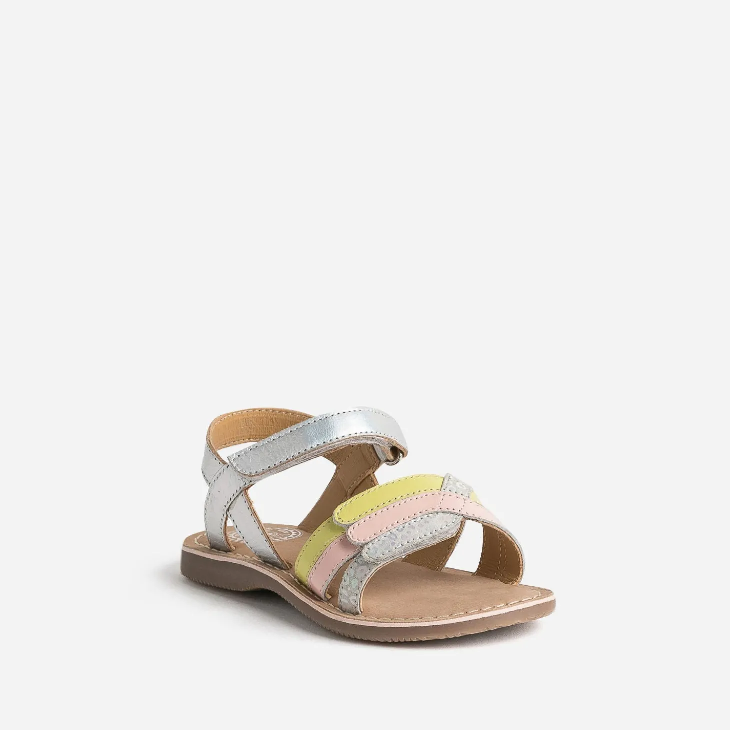 On la veut fonctionnelle et jolie, colorée et adaptable à l’envi. Voilà une sandale pour petite fille qui coche toutes les cases. En cuir métallisé, elle associe des reflets iridescents à un jaune pâle et un rose poudré vernis, sur deux brides, l’une fine et l’autre large, fermées par scratchs. Un modèle qui matche avec la plupart de ses looks d’été, débardeur et short, robe à bretelles et jupe qui tourne.