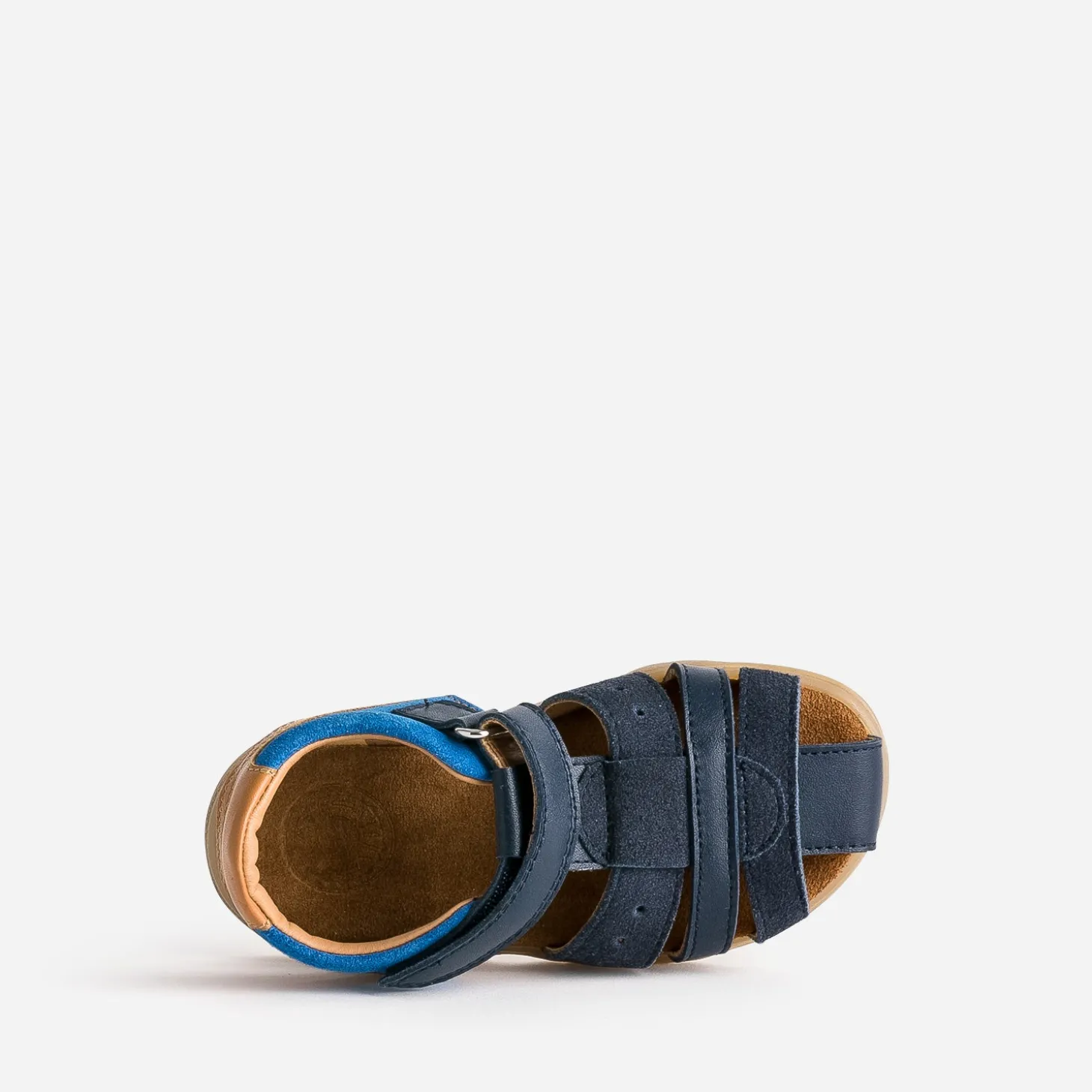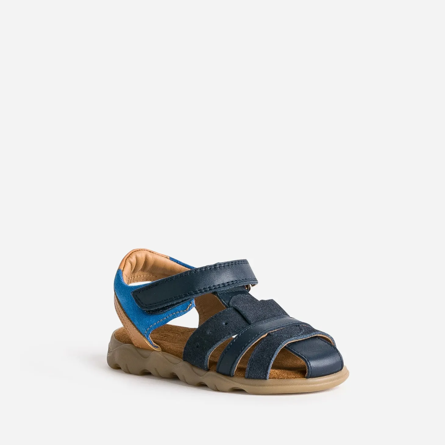Les notions de confort et de protection sont inhérentes à la sandale pour petit garçon. La preuve avec ce modèle alliant cuir velours et cuir lisse, formé de multiples brides jusqu’au bout du pied. La semelle intérieure accueille le pied en douceur, grâce au cuir velours, la fermeture par scratch participe à l’autonomie des plus petits. Bleu marine, bleu vif et camel, elle s’accorde facilement aux tenues de saison.