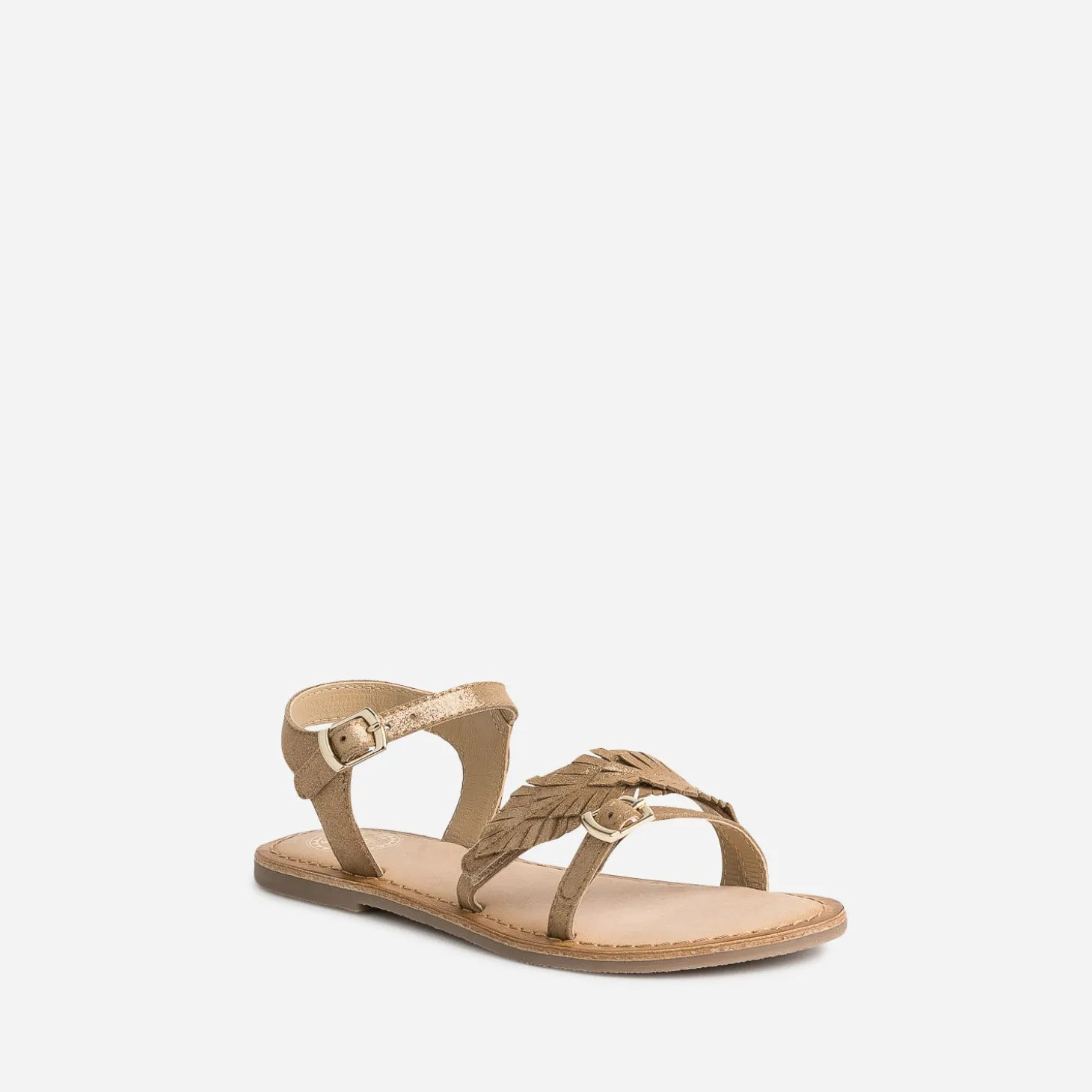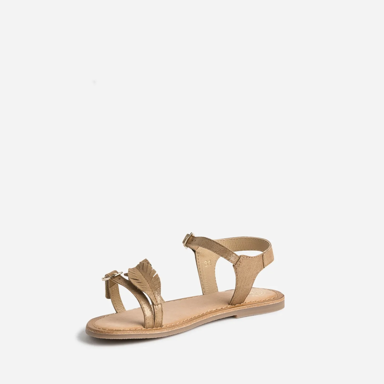 En cuir velours marron, avec finition irisée, cette sandale fille apporte une touche d’élégance aux tenues. Construite avec 3 brides, elle est décorée d’une plume sur le dessus. Elle se ferme par boucles, à ajuster en fonction de la largeur du pied.