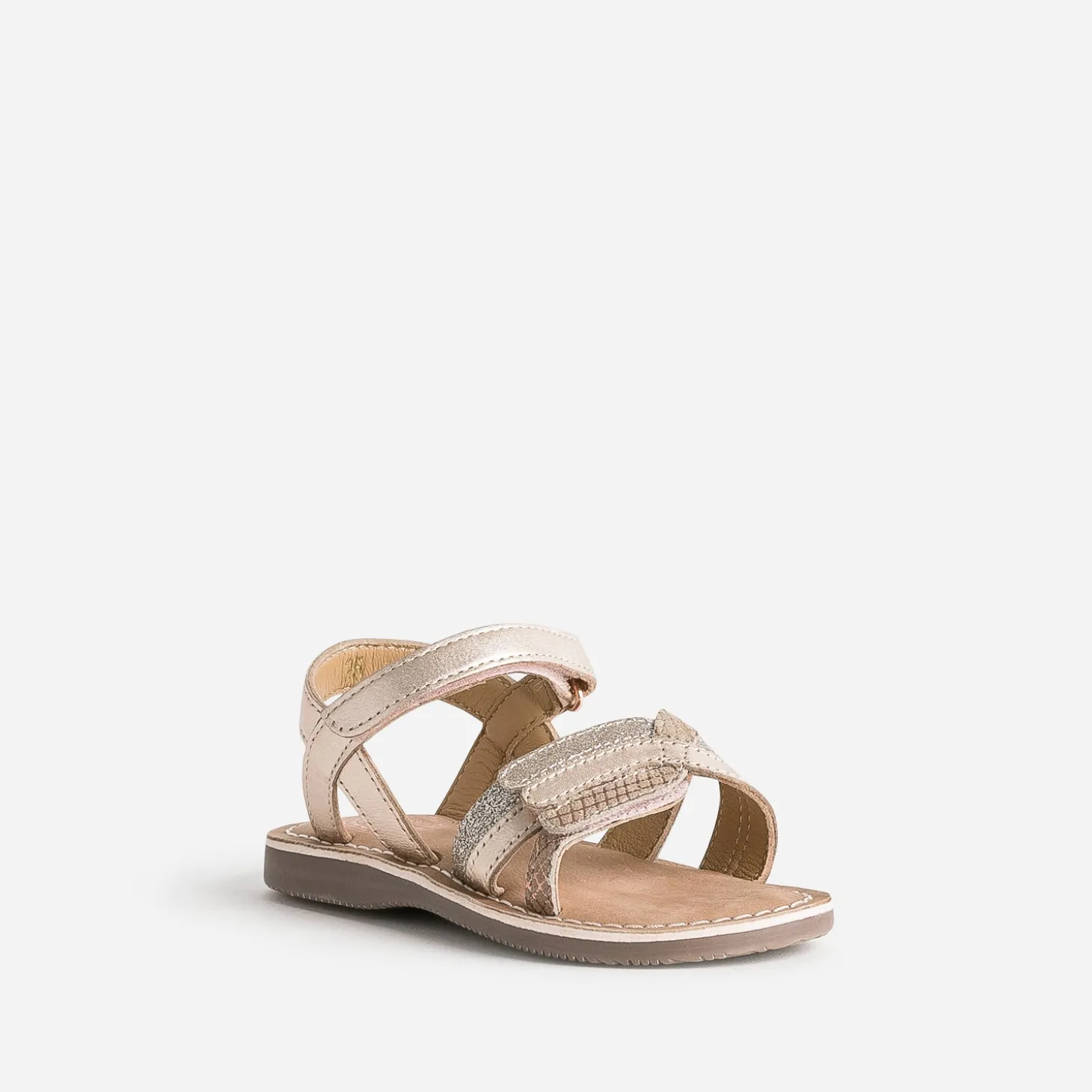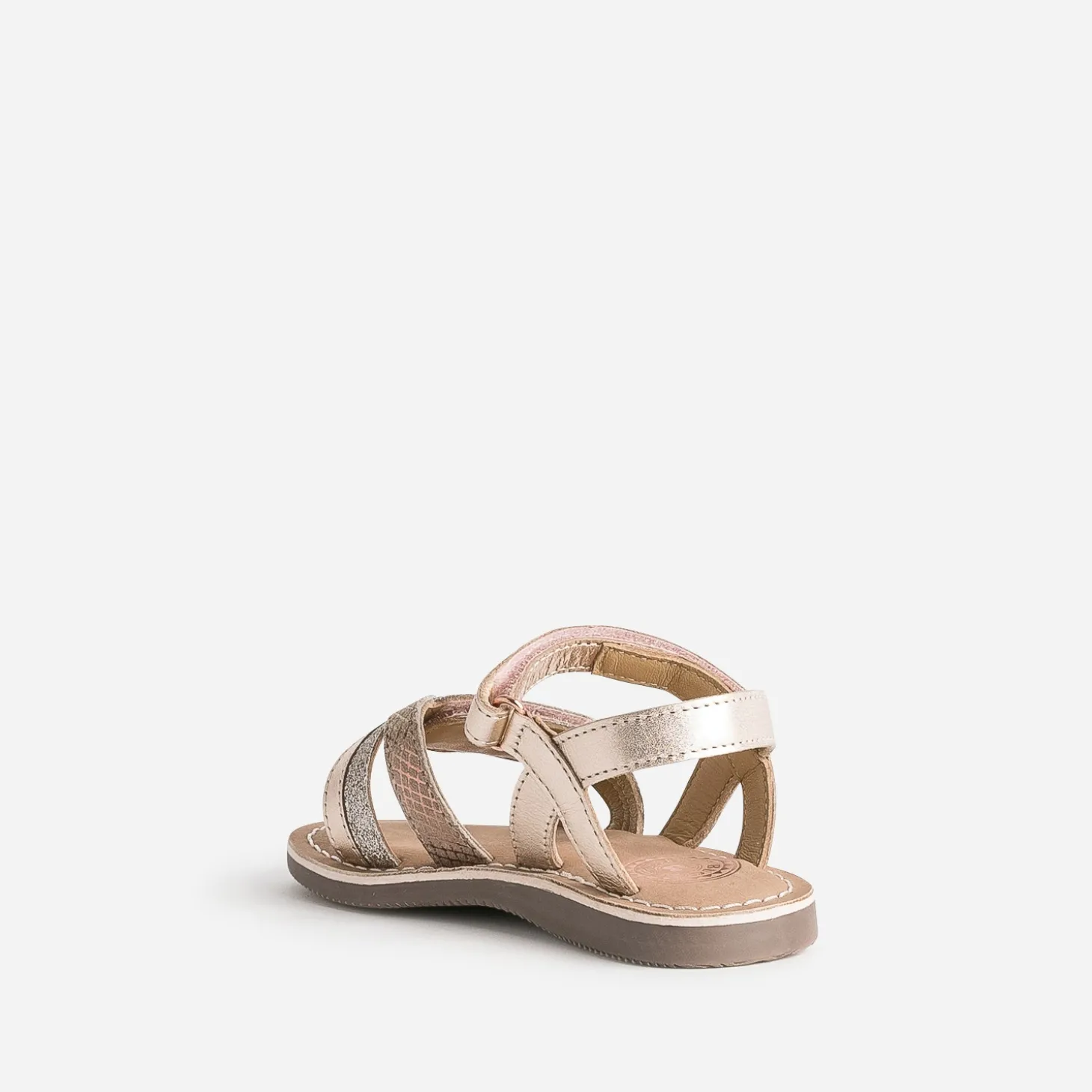 Le rose cuivré ? C’est le nouveau doré. Plus doux, moins bling-bling, il sublime le cuir lisse de cette sandale pour fille. La bride avant y associe aussi imprimé graphique et paillettes. La fermeture par scratchs permet d’ajuster le confort du pied. Privilégiez-la avec une tenue dans les tons pastel.