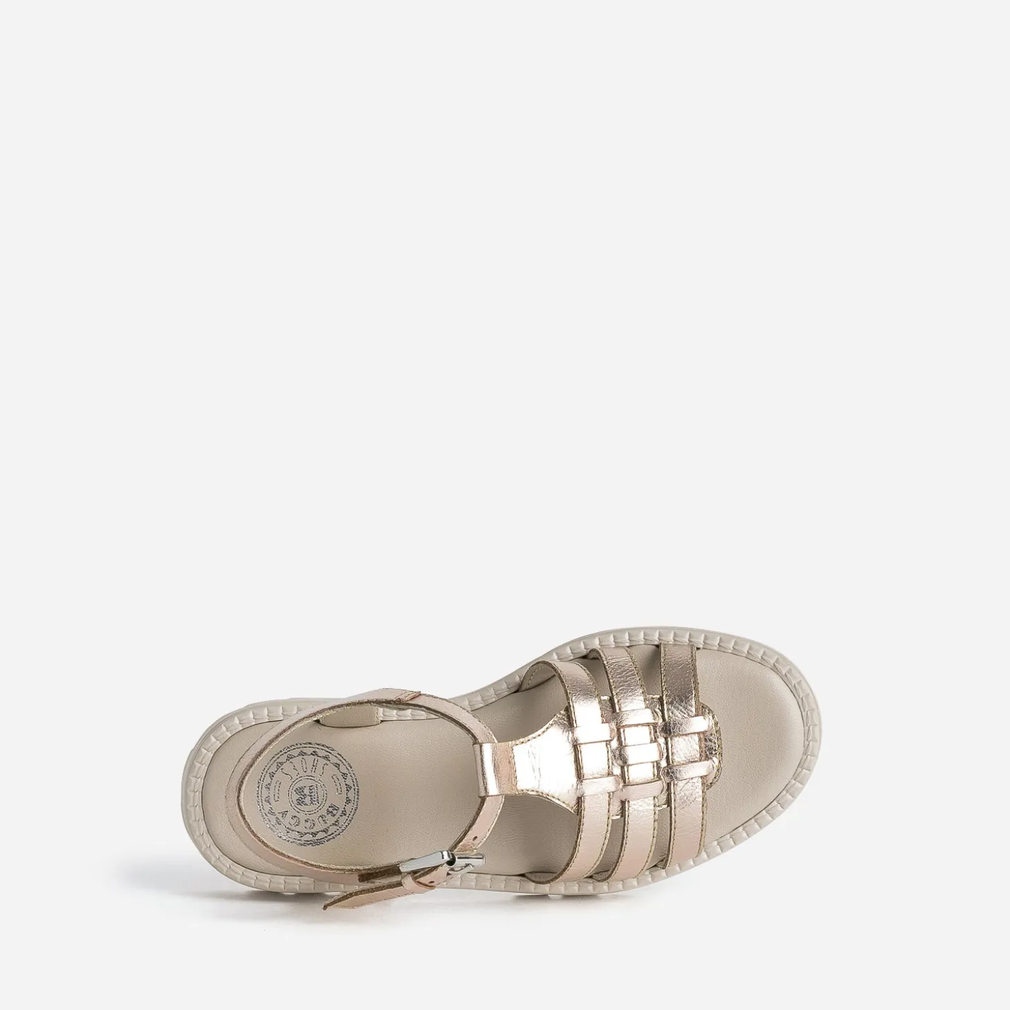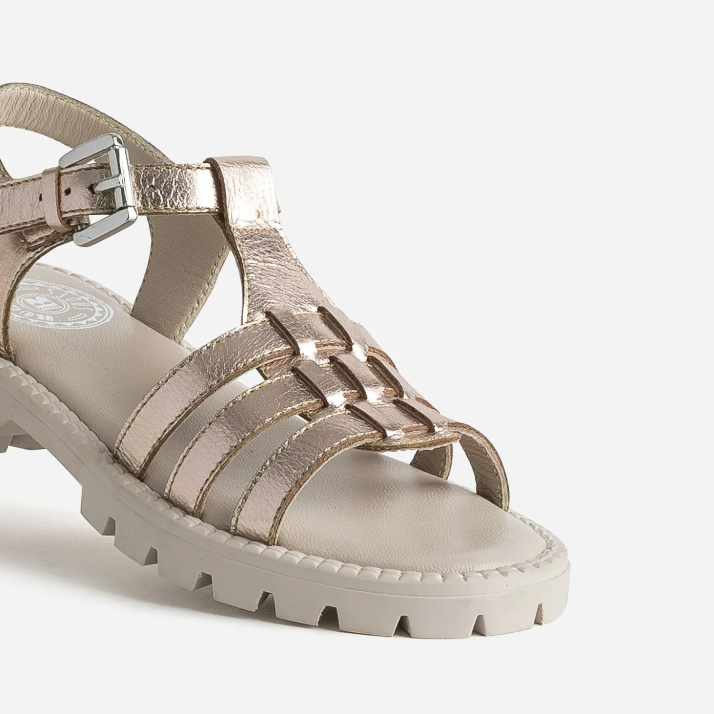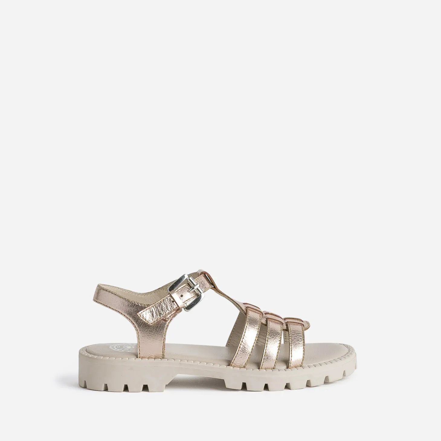La tendance est aux chaussures à semelle crantée. C’est donc le parti pris stylistique de cette sandale pour fille. En cuir métallisé cuivré, elle présente 3 brides sur le dessus du pied et de ferme par une bride à boucle autour de la cheville. Un modèle très mode, qu’elle aimera porter tout au long de l’été.