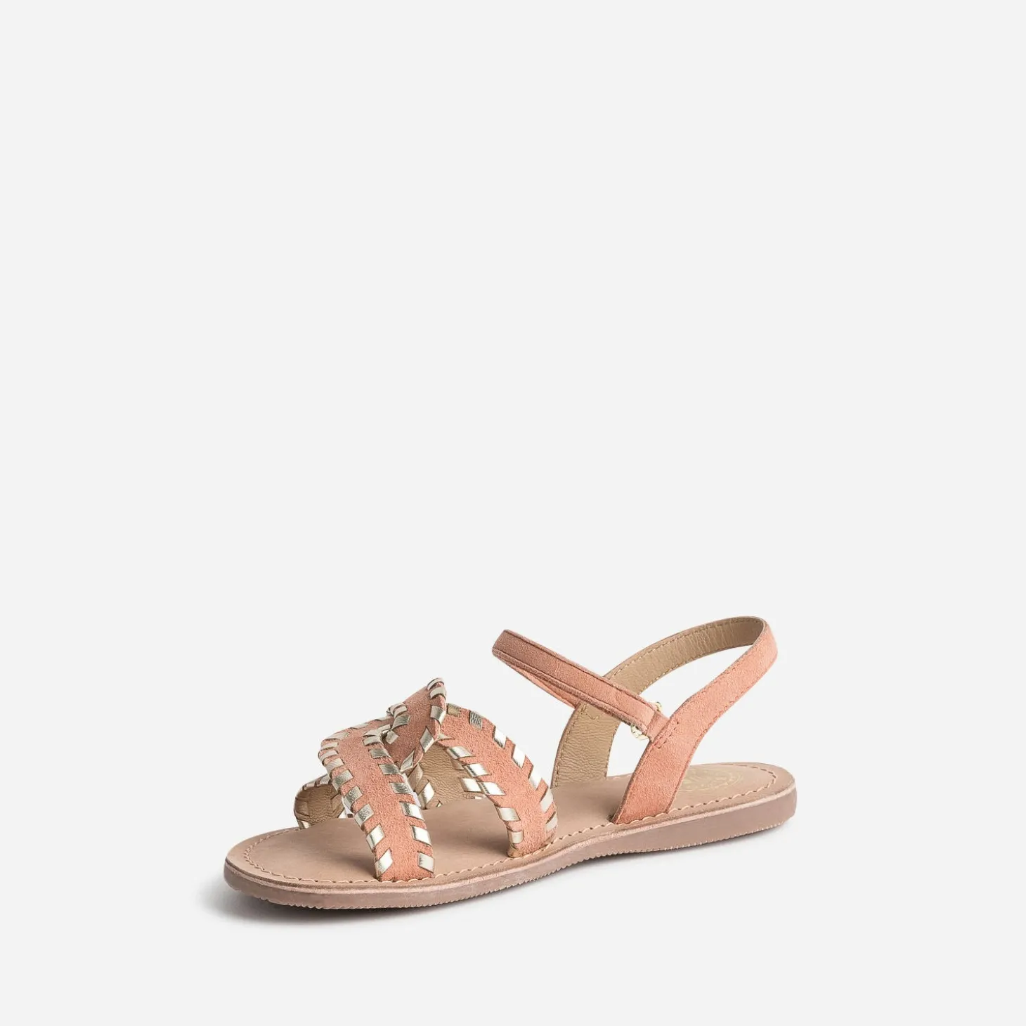 Cette sandale fille séduit par le cuir velours et le coloris rose saumon, par les brides croisées sur le dessus du pied et le tressage doré. Elle se ferme par un scratch, à ajuster en fonction du cou-de-pied. A associer avec des teintes pastel, amande, jaune ou ciel.