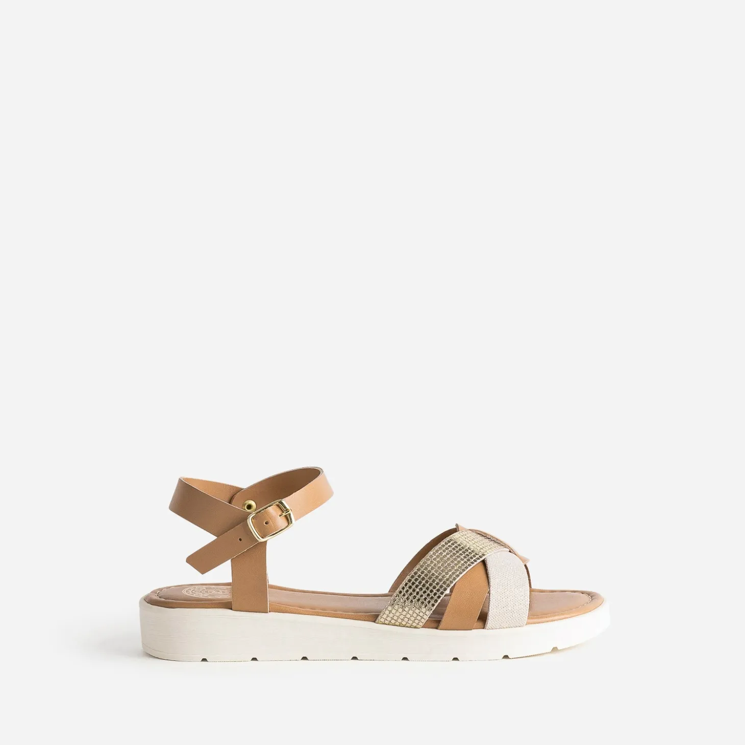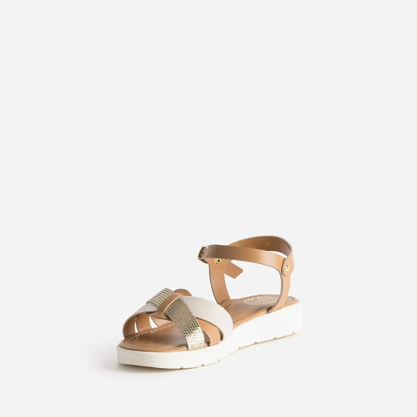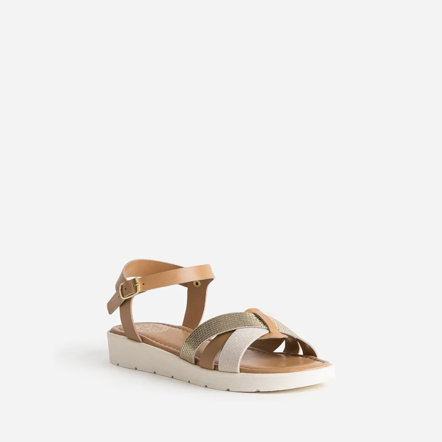 Camel et doré est un combo à ne pas négliger, notamment en été. La preuve : il sublime cette sandale pour junior fille, par un jeu de brides croisées sur le dessus du pied. Pour une cérémonie, comme au quotidien, elle s’accorde avec tout, avec une incroyable facilité.