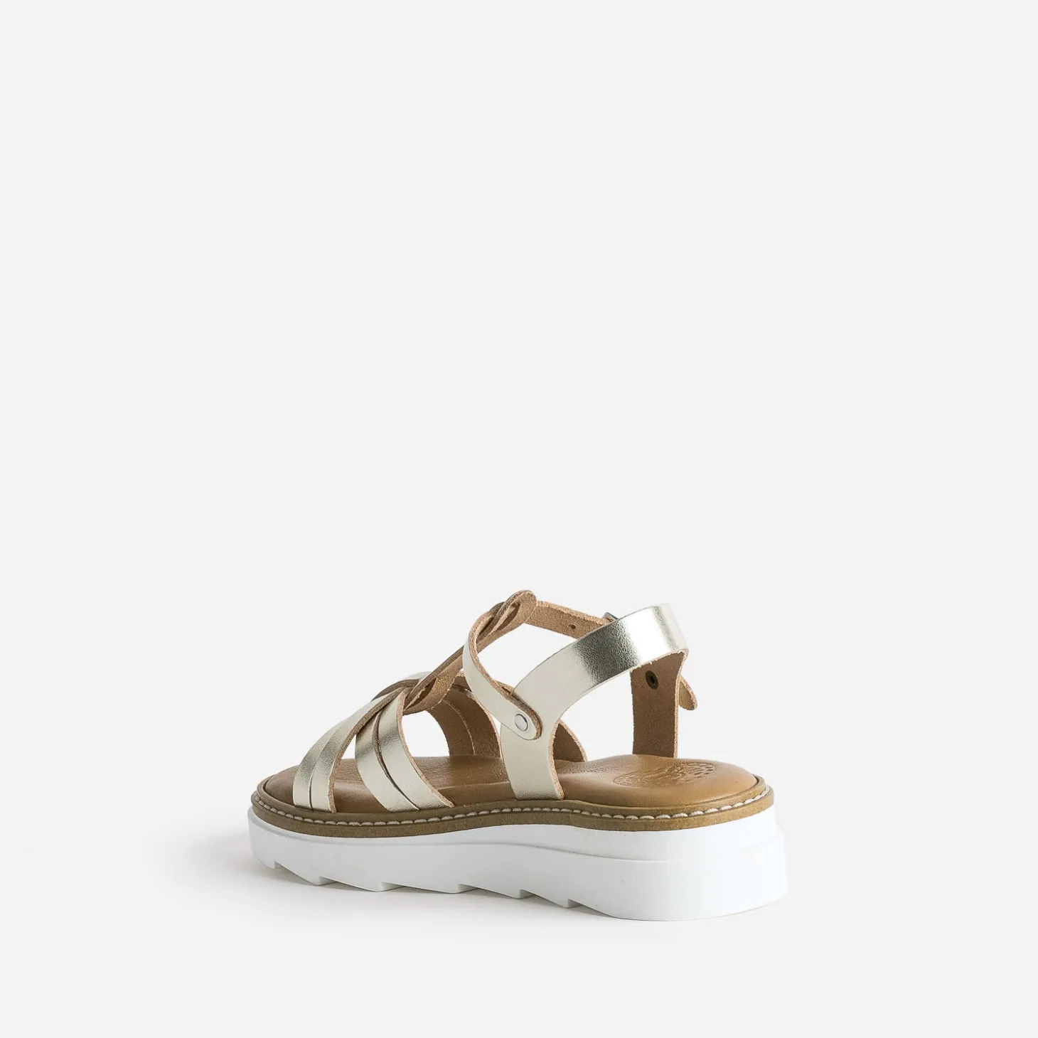 Compensée juste comme il faut (3 cm), cette sandale va séduire les petites filles. En cuir lisse, elle opte pour un coloris doré sur les brides et la semelle extérieure ; une semelle crantée pour une meilleure adhérence. A l’intérieur, la semelle première est moussée pour un confort inégalé. Un modèle à associer avec un combi-short en jean bleu ou bien un look graphique en duo de noir et blanc.
