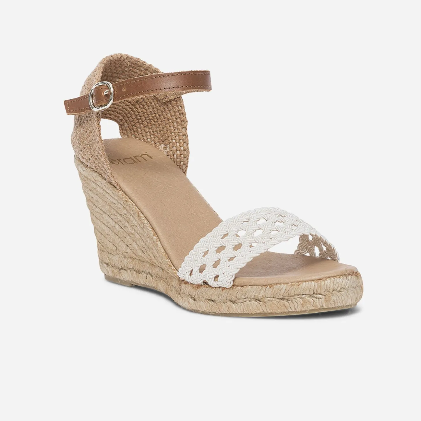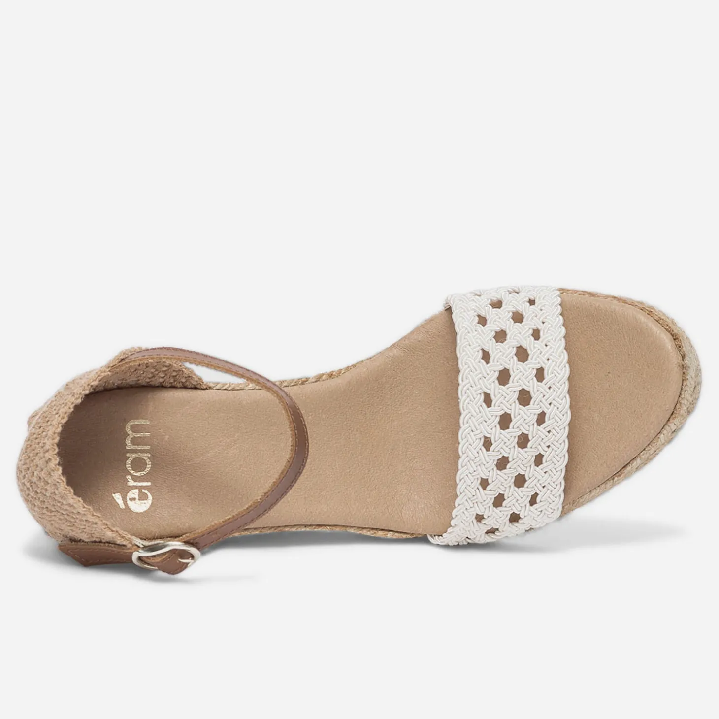 L’esprit croisière anime cette sandale compensée pour femme. Montée sur un talon en corde de 9 cm, avec patin avant de 2 cm, elle maintient le pied, à l’avant par une large bride écrue tressée, à l’arrière par une tige souple en coton biologique certifié GOTS marron, à la cheville par une bride synthétique camel. Un modèle à porter avec un tailleur-short ou bermuda, en lin, dans des teintes naturelles ou pastel.
