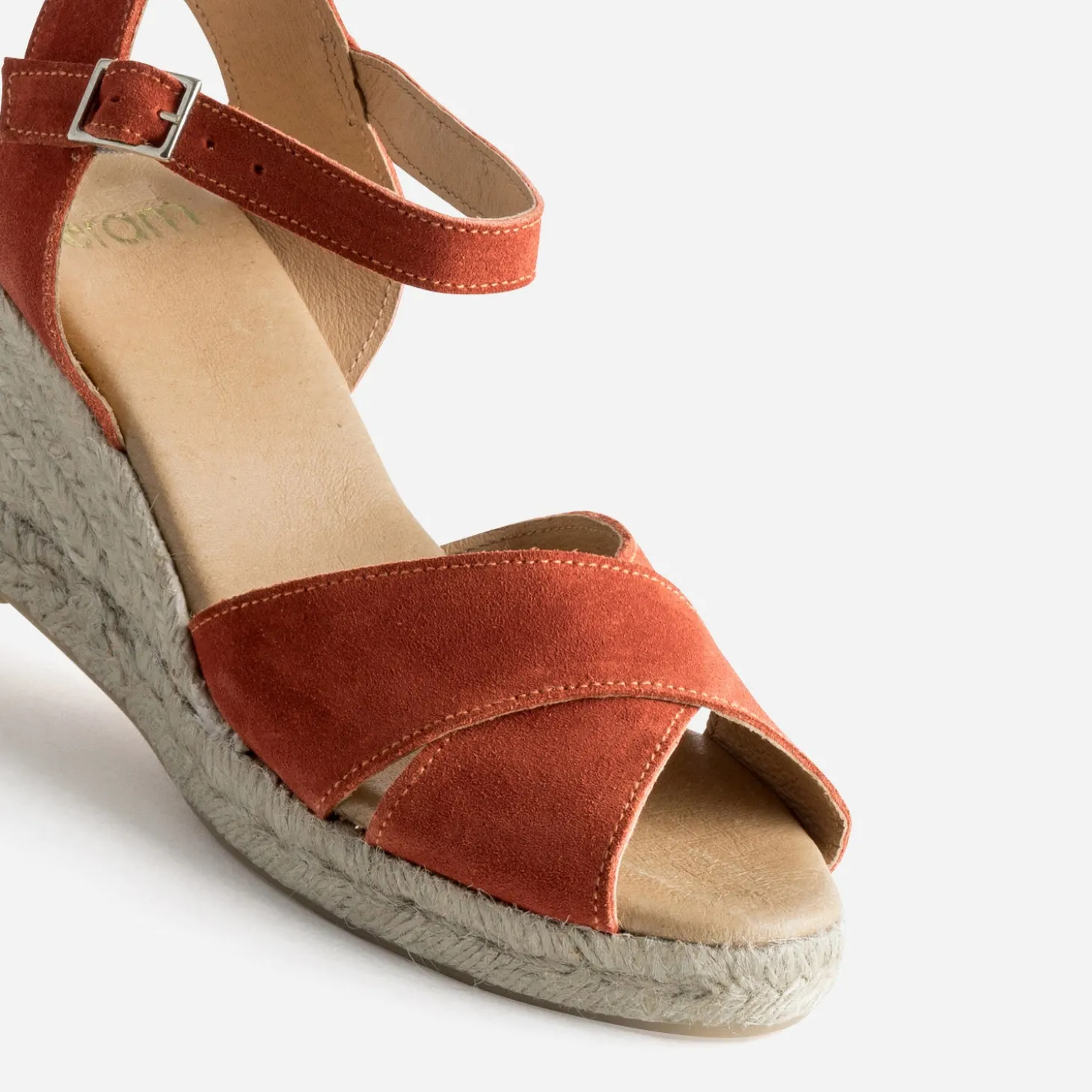 Ajustez votre style au changement de saison avec la sandale compensée pour femme. Brides croisées en cuir velours, coloris orange foncé, semelle première moussée et talon en corde naturelle : elle confirme un statut mode, sans perdre en confort. Un modèle idéal pour mettre en valeur une robe midi à imprimé fleuri et un joli verni assorti.