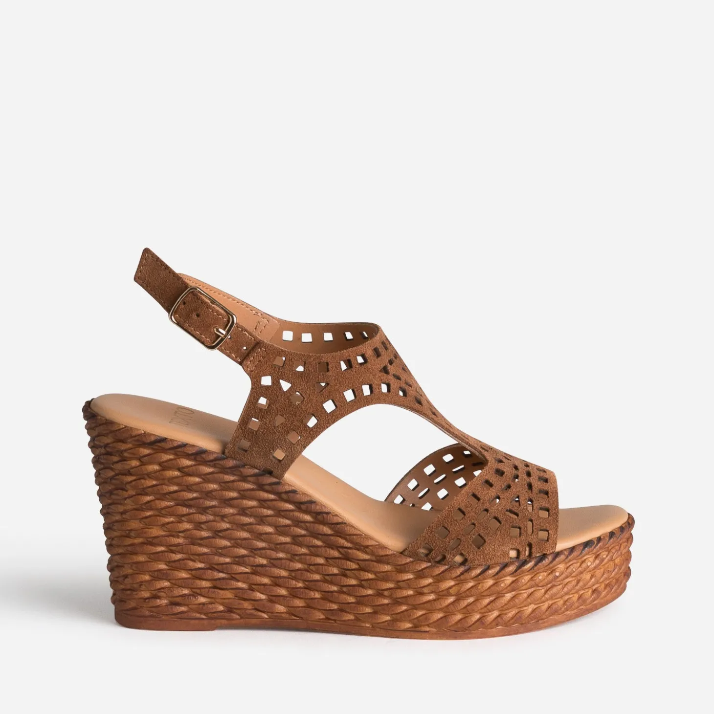 La sandale compensée fait, chaque année, son retour aux beaux jours. Alliée incontournable d’une silhouette élancée, elle se décline en coloris camel, sur un cuir velours perforé. Le talon, recouvert d’un effet corde ton sur ton, offre un confort optimal sans sacrifier le style. Un modèle parfait avec une robe fluide ou une blouse sur un jean flare, signature d’une silhouette estivale et féminine.