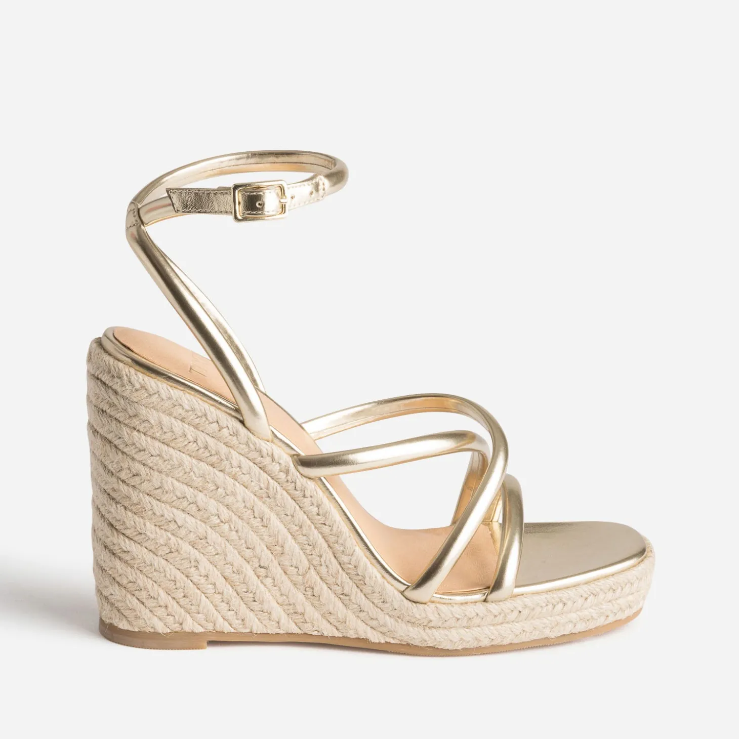Envie de prendre de la hauteur ? Cette sandale pour femme est une solution. En matière synthétique dorée, elle présente un talon compensé de 11 cm à l’arrière et 2 cm à l’avant. Bout carré et fines brides matelassées lui apportent une belle modernité. Avec ? Combinaison-pantalon, robe ou look denim bleu, tout s’accorde à a perfection.
