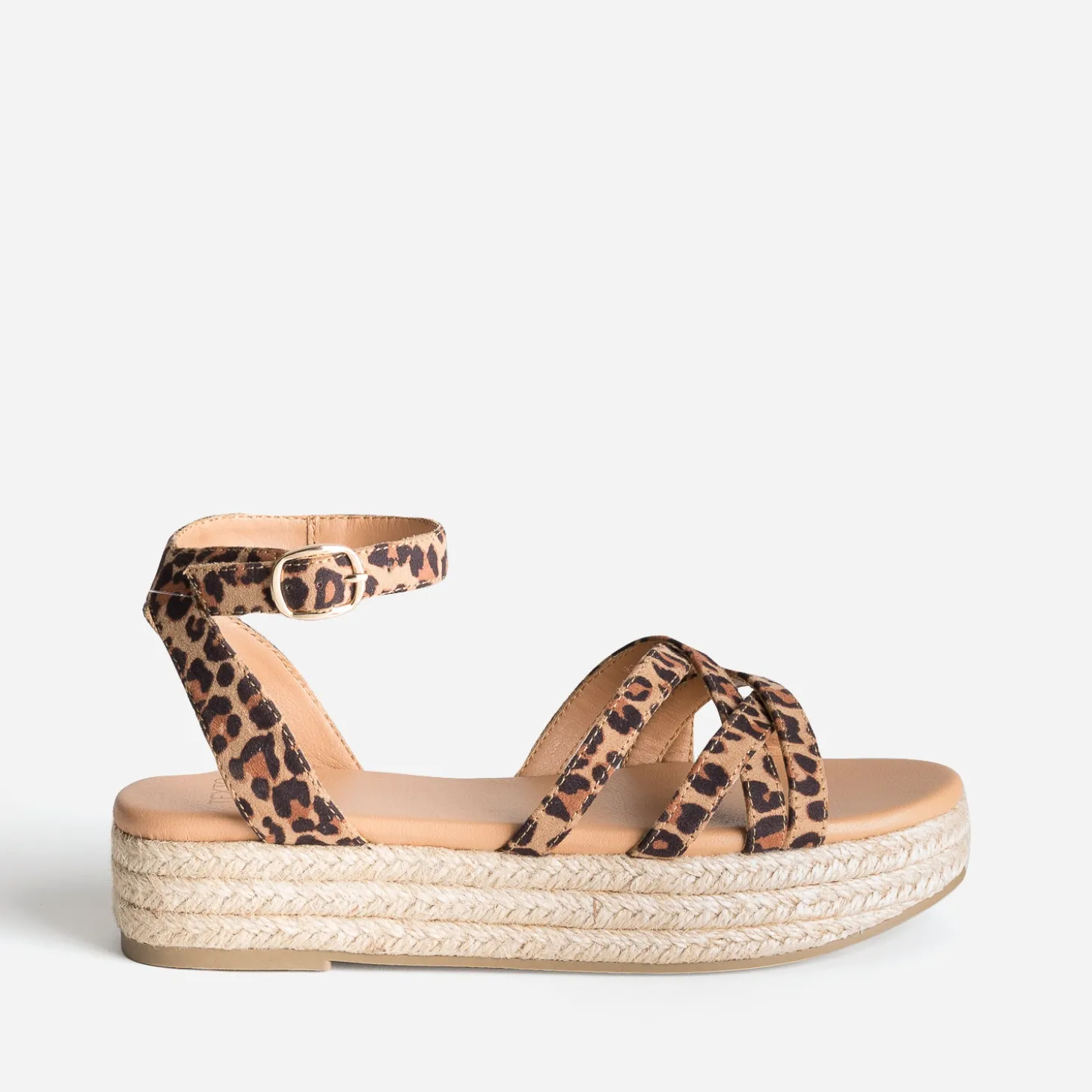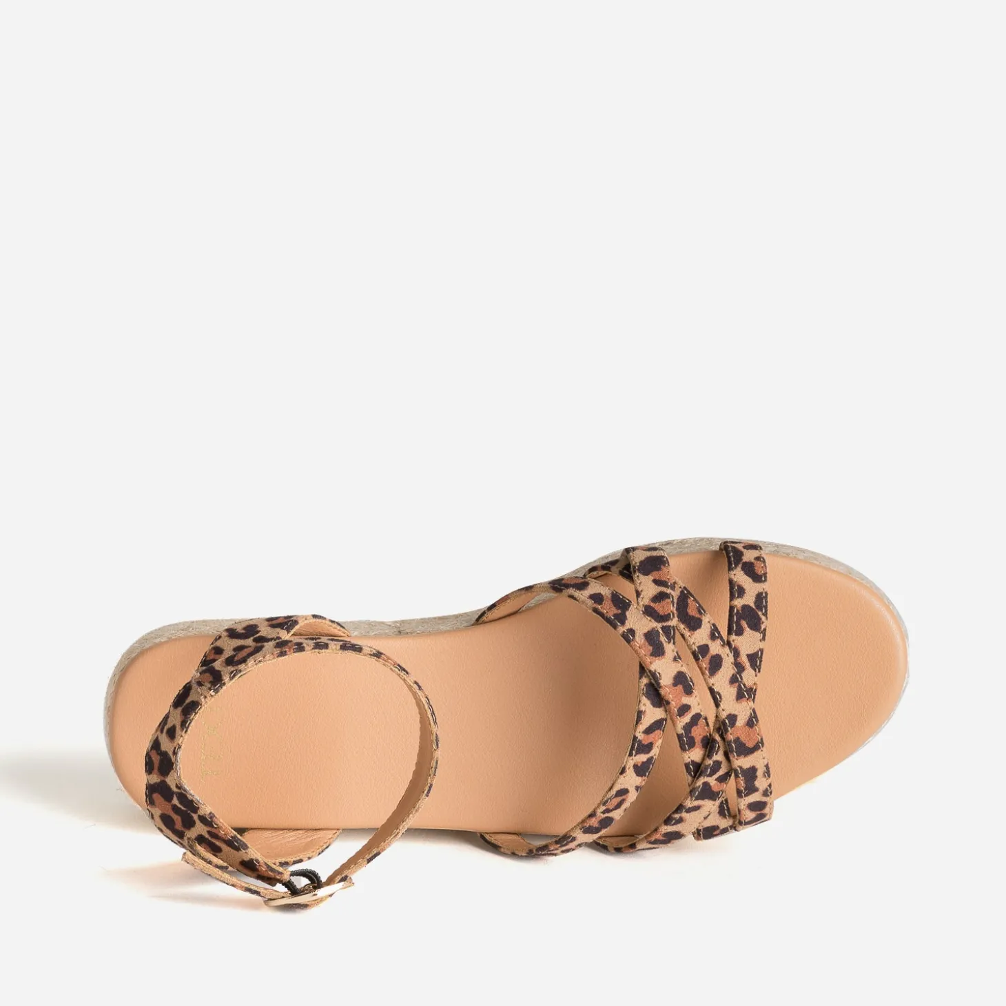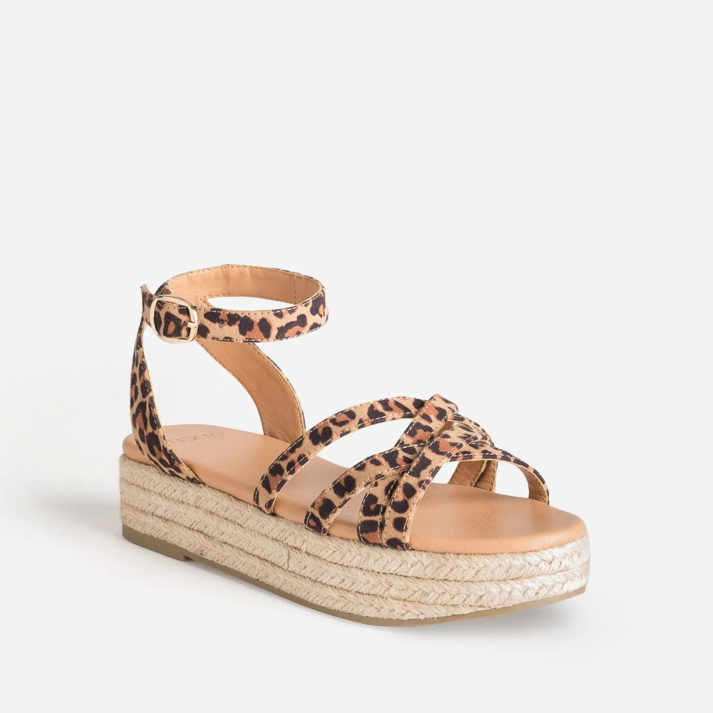 Brides croisées sur le dessus du pied. Bride autour de la cheville. La sandale à plateforme ne manque pas de maintenir le pied. En textile beige, elle ose l’imprimé léopard incontournable de la saison sur une semelle en corde. Un modèle à essayer avec une robe noire, un pantalon large ou un short : elle s’accorde avec tout !