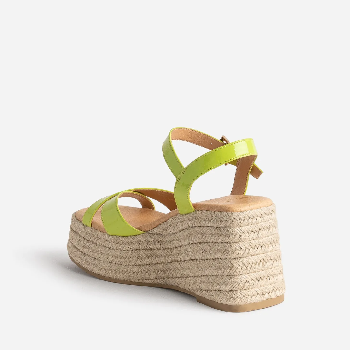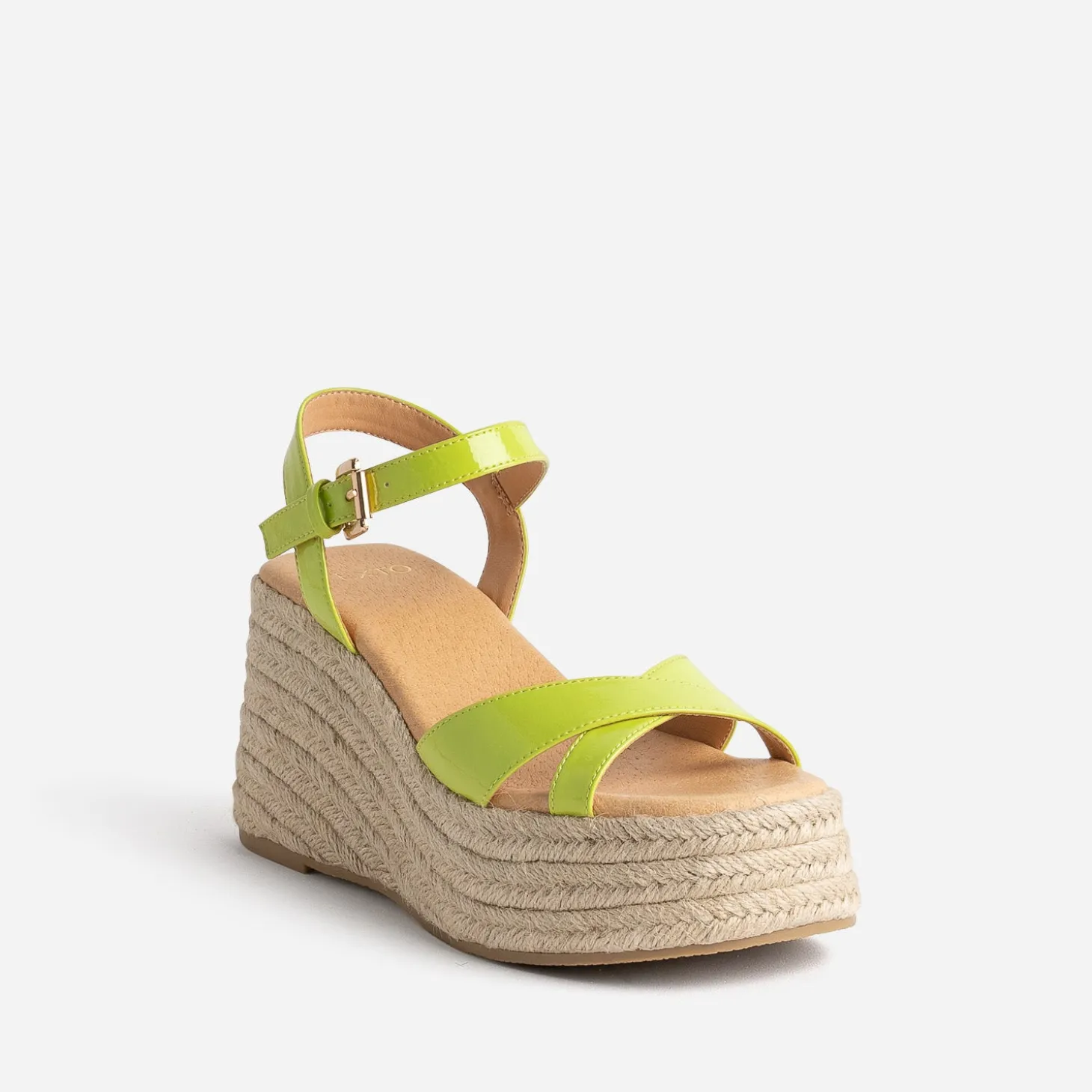 L’invention parfaite pour gagner des centimètres sans risques ? C’est la sandale compensée, avec plateforme. Ici, la semelle de 9 cm à l’arrière et de 4 cm à l’avant est entièrement recouverte de corde naturelle. Dessus, les brides en matière synthétique se déclinent en coloris lime, avec finition vernie. A vous les jolies robes dans les nuances de bleu, de vert ou de rose.